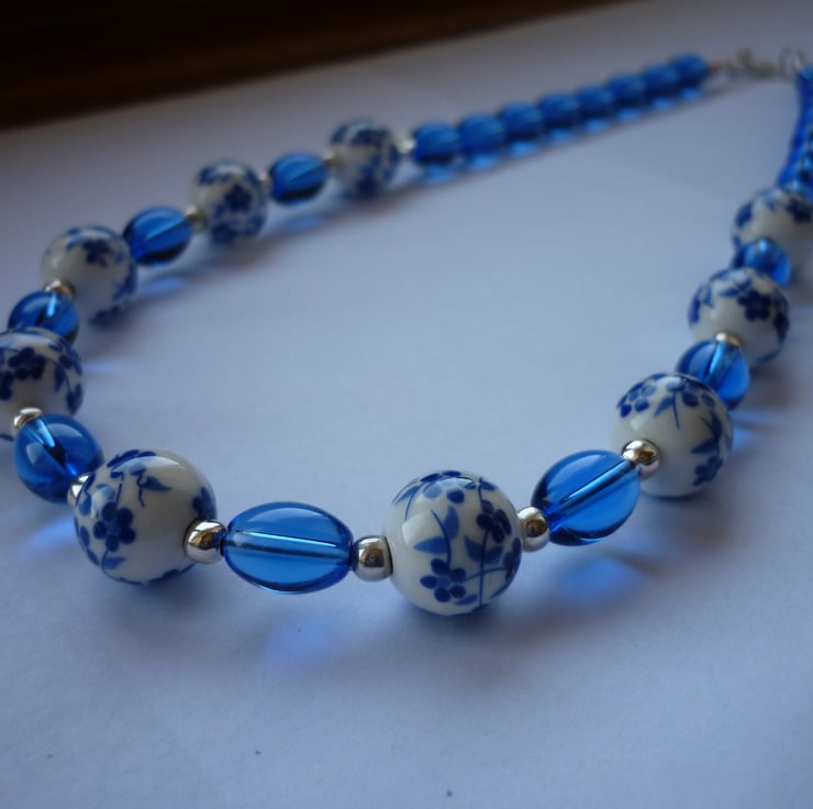 THE NECKLACE HAS BEEN MADE USING ROUND 12MM CERAMIC BEADS IN SHADES OF BLUE AND WHITE FLORAL PATTERN ALONG WITH OVAL GLASS BLUE BEADS, SMALL SILVER ROUND SPACER BEADS, SILVER FLOWER SPACER BEADS AND FINISHED WITH SILVER PLATED LOBSTER CLASP AND FINDINGS.