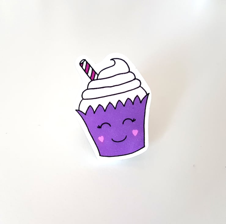 This listing is for one Kawaii cupcake pin, complete with a lilac casing, white icing, and red and white striped straw! With a very cute face to finish!