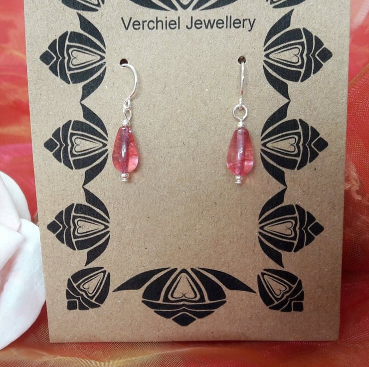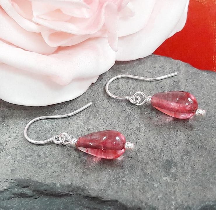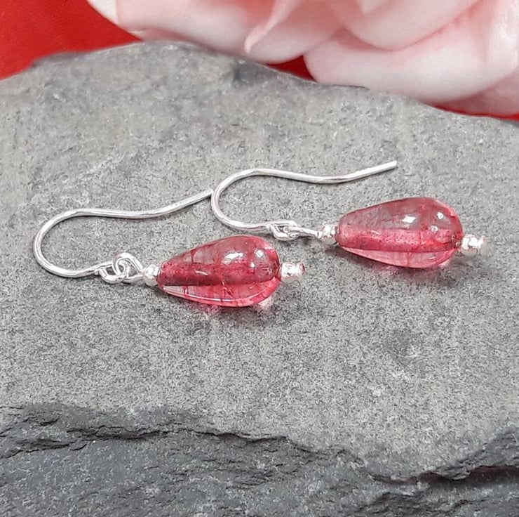 Elegant pink crackle quartz teardrop Gemstone Earrings with tiny sterling silver beads and fittings