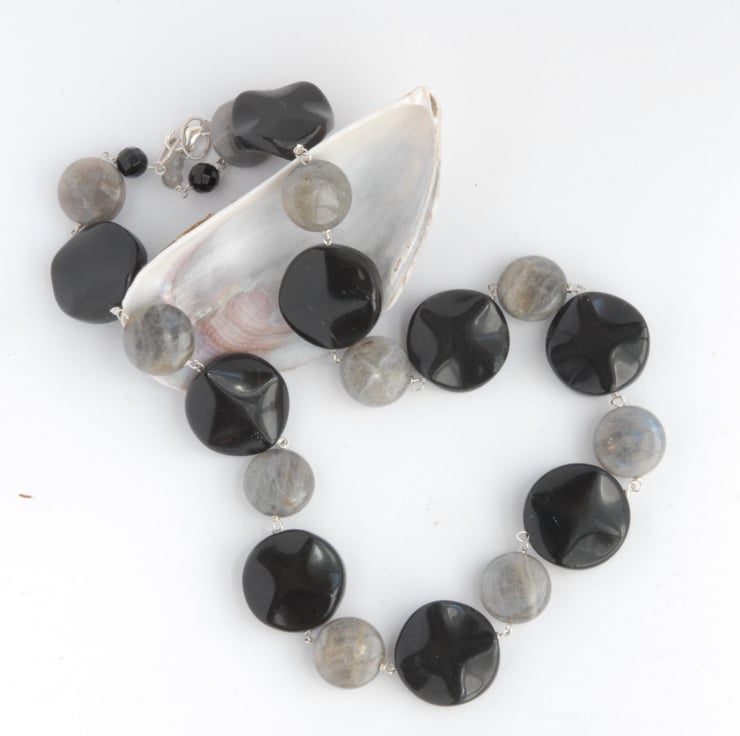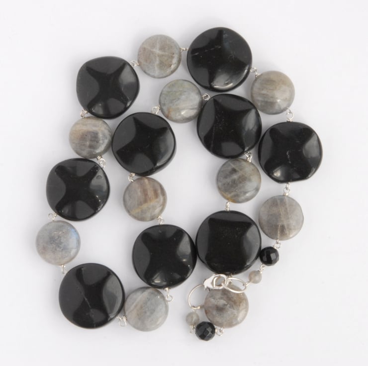 This chunky necklace features coin beads of flashy labradorite and wavey coins of glossy black onyx. The labradorite has a soft grey ground and then eye catching broad flashes of blue, green, golden yellow and peach. Each bead is individually rosary linked on sterling silver wire so that the beads can move to catch the light and the necklace will gently drape round the neckline. Finished with a sterling silver trigger clasp and big jump ring to make it easy to put on.
