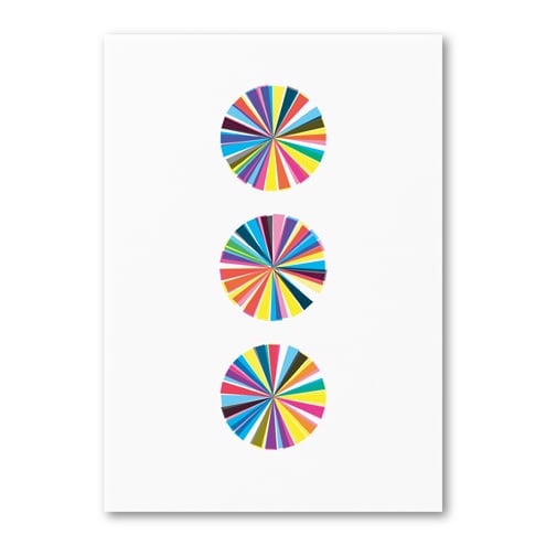 One A6 sized 'Carousel No.1' greetings card. A vibrant retro design, printed in mis-aligned rainbow colours on a smooth white board.