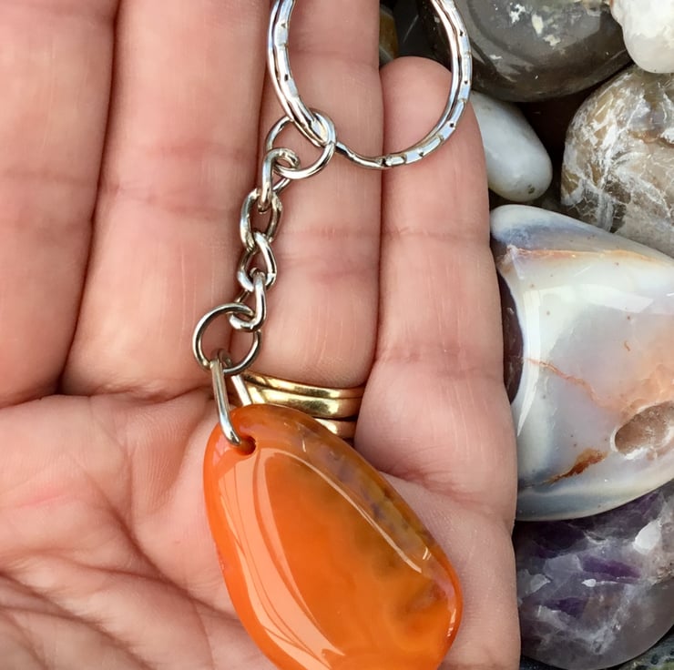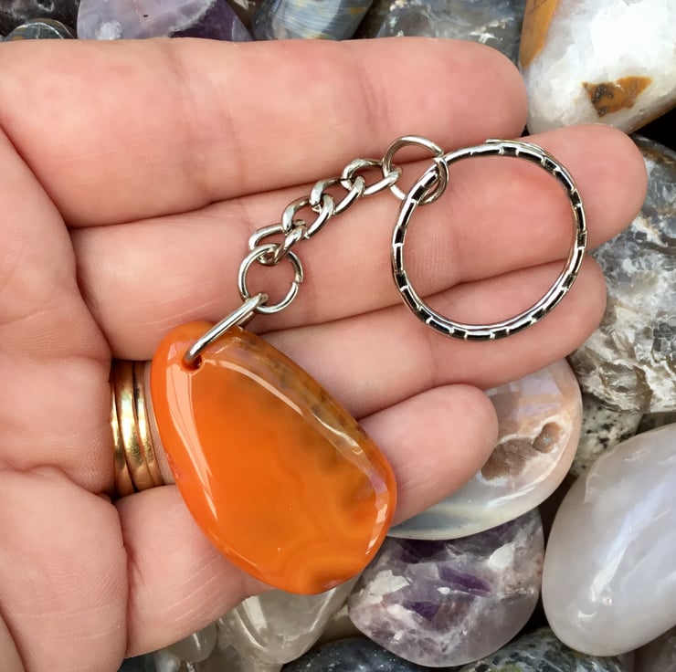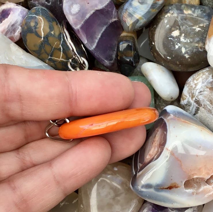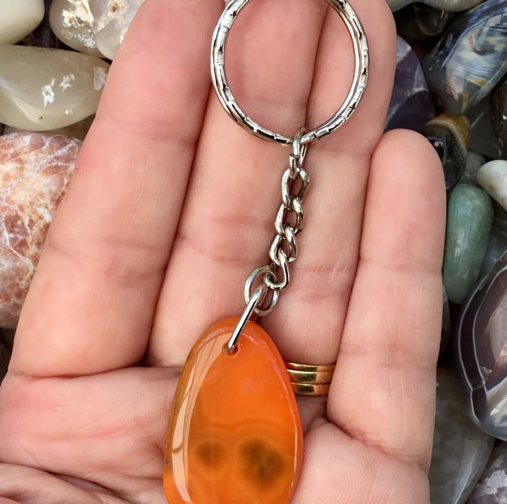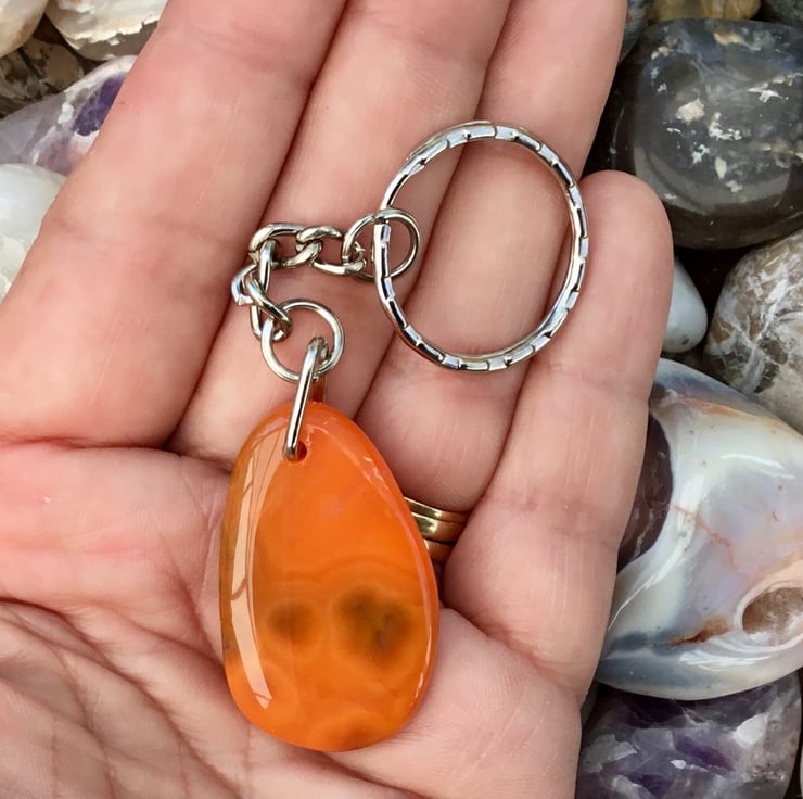 This pretty and bright orange Agate Gemstone is smooth both sides, rounded edges, highly polished all over and has been simply drilled in the centre of the top to support a silver tone triangle bail, from which the curb style keychain & 2.5cm diameter split ring have been attached.