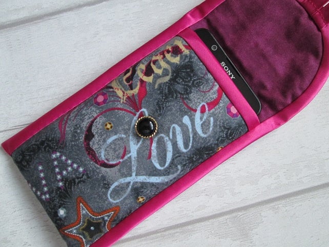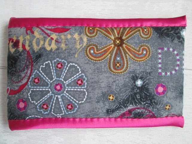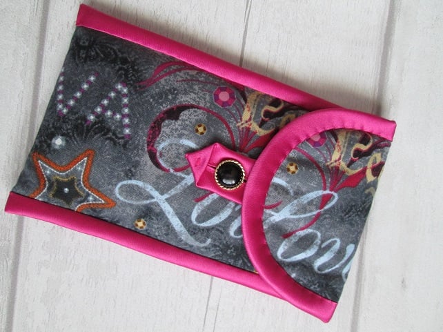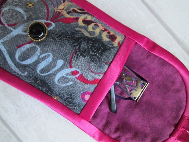 This is a really fun print with hints of bling, lace and tattoos, and words like 'love', 'legendary' and, of course 'Diva'. I've picked up on the pinks in the design with a deep pink lining and bright pink satin bias binding. Lightly wadded to protect the contents, it's entirely hand sewn and finished with a button and loop fastening. A great gift for a teenager, it will comfortably take most pairs of glasses, a phone up to 15 cm x 7.5 cm x 1 cm, a camera up to 12 cm x 6 cm x 3 cm, 6/7 pens/pencils or 5/6 tampons.