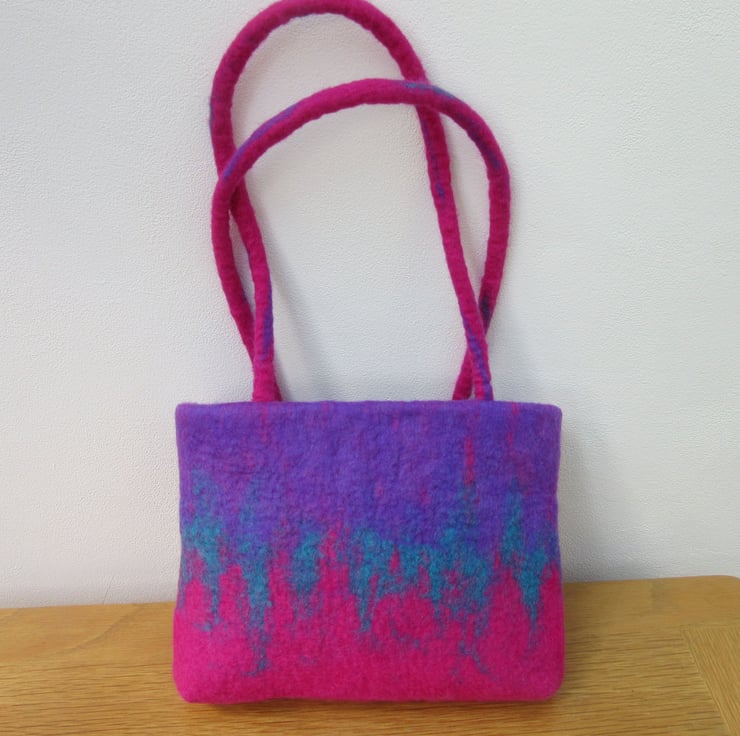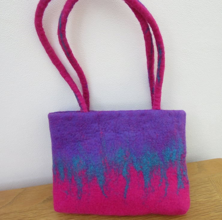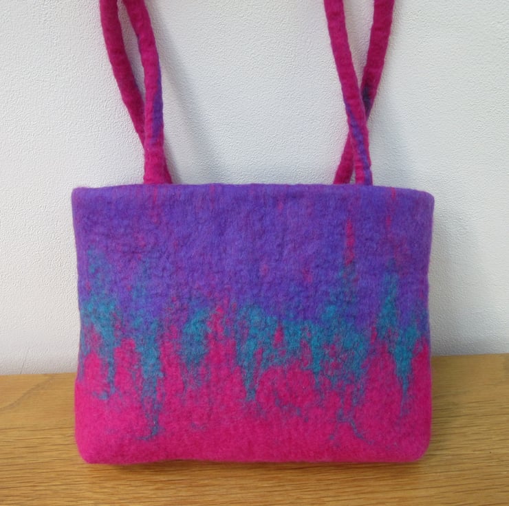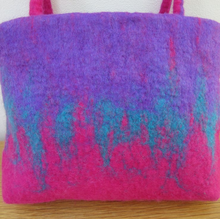 Hand felted handbag in mauve, turquoise and pink 100% merino wool made using the wet felting method.