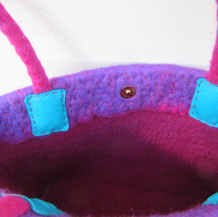 Made in one piece the bag has no seams and has a hand rolled felt rope handle. The bag has a magnetic clasp fastening and is unlined The inside of the bag is dark pink and where the handles join the bag they are covered with bright turquoise leather.