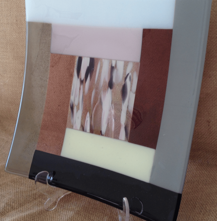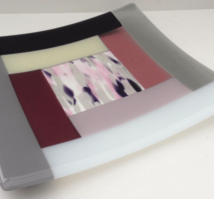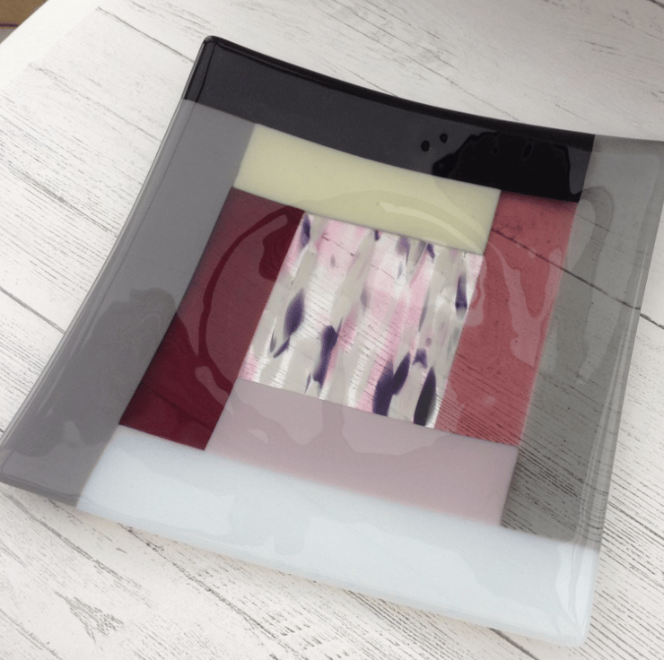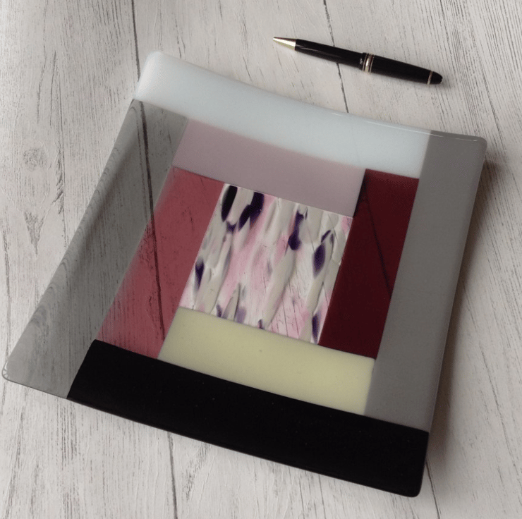 I have made this square plate from hand-cut stripes of glass in shades of black, grey, cream, white and purples in both opaque and transparent glass with a pretty patterned square in coordinating colours at the centre. The striped pieces have been topped with a sheet of clear glass and then fired in the kiln to fuse them together. After cooling, the piece was then shaped by placing over a mould and re-firing.