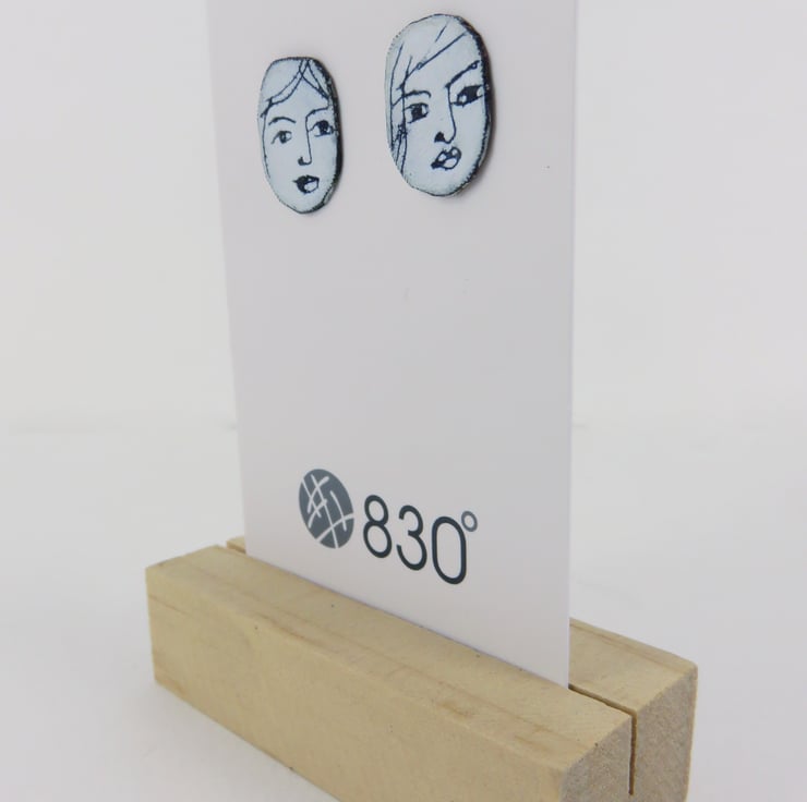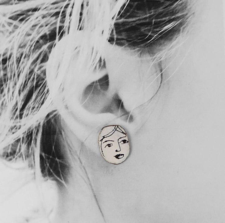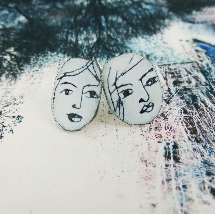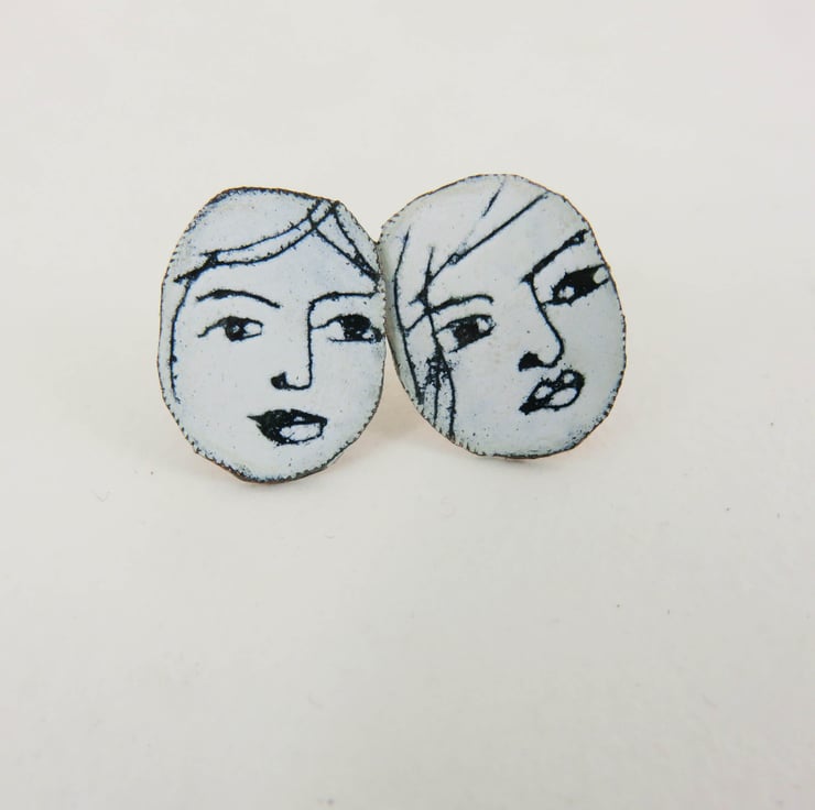 These stud earrings are hand cut from copper, 15mm approximately in size. A layer of black enamel is fired on the copper, then a layer of white enamel is painted over it. I then draw faces into the white enamel A final firing in the kiln at 830 degrees creates a permanent finish. The earring posts are silver and soldered on the back. Each stud is individual and unique.