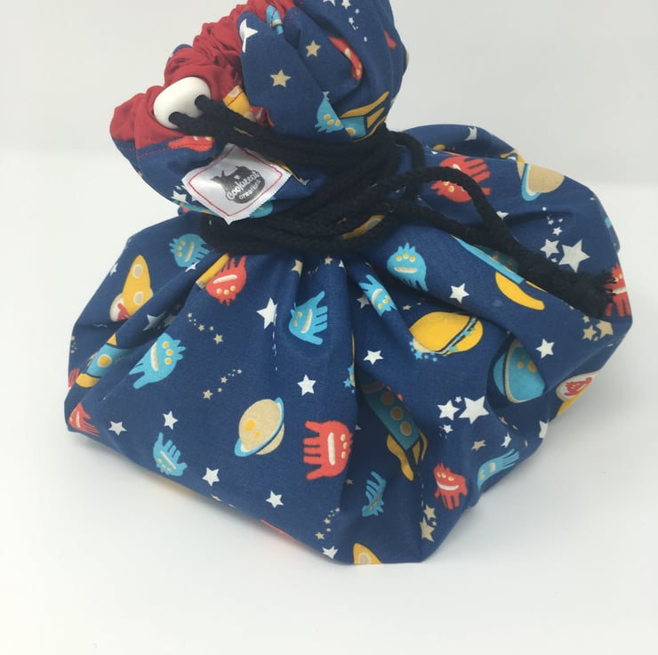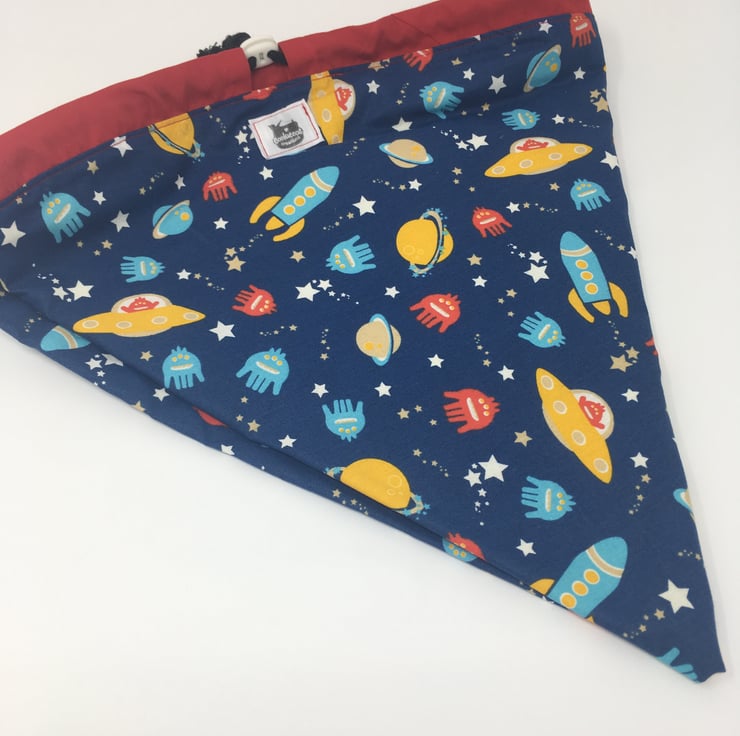 This is a fun space themed print on a blue background with a yellow lining and red edging for the drawstring channel.