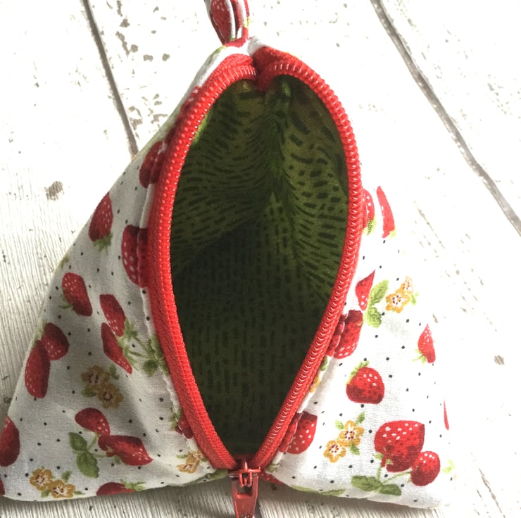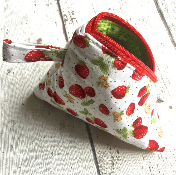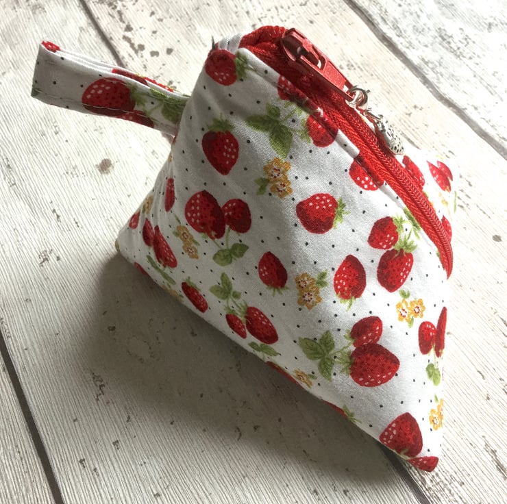 This delightful little purse could be used to hold all manner of things not just small change and the fabric tab means it can be attached to a bag. The white cotton fabric has a strawberry pattern in shades of red with green leaves, gold flowers and a dusting of tiny black spots. The bright red zip has a detachable silver coloured metal strawberry charm attached with a silver coloured split ring and lobster hook.