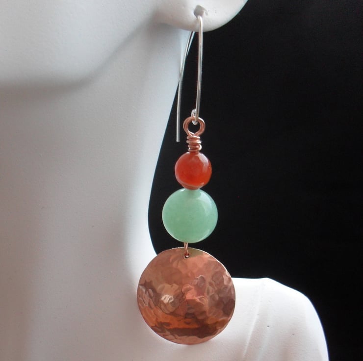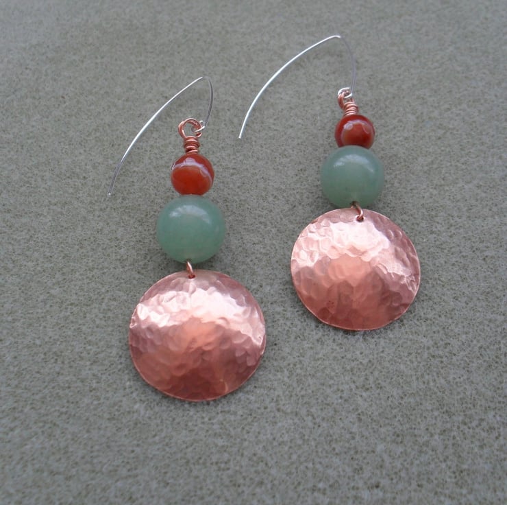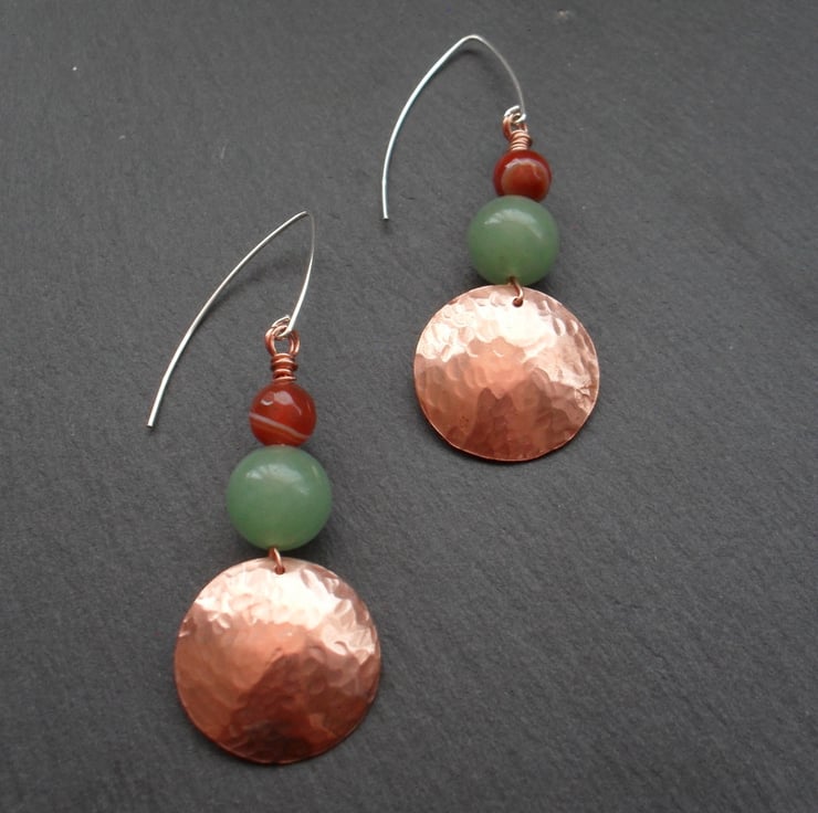Disc's have then been attached to sterling silver ear wires with copper wire, earrings have semi precious gemstones of Deep orange agate which have white markings within the stones and green aventurine
