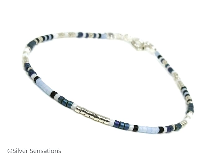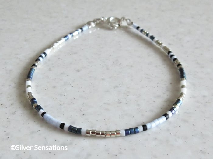 This skinny seed bead bracelet has tiny Miyuki Delica 1.8mm seed beads in silver, pale blue, dark blue & white with a touch of matte black creating a wonderful contrast to this theme.