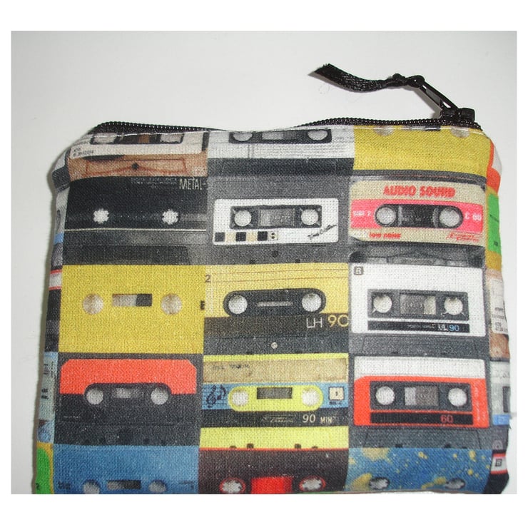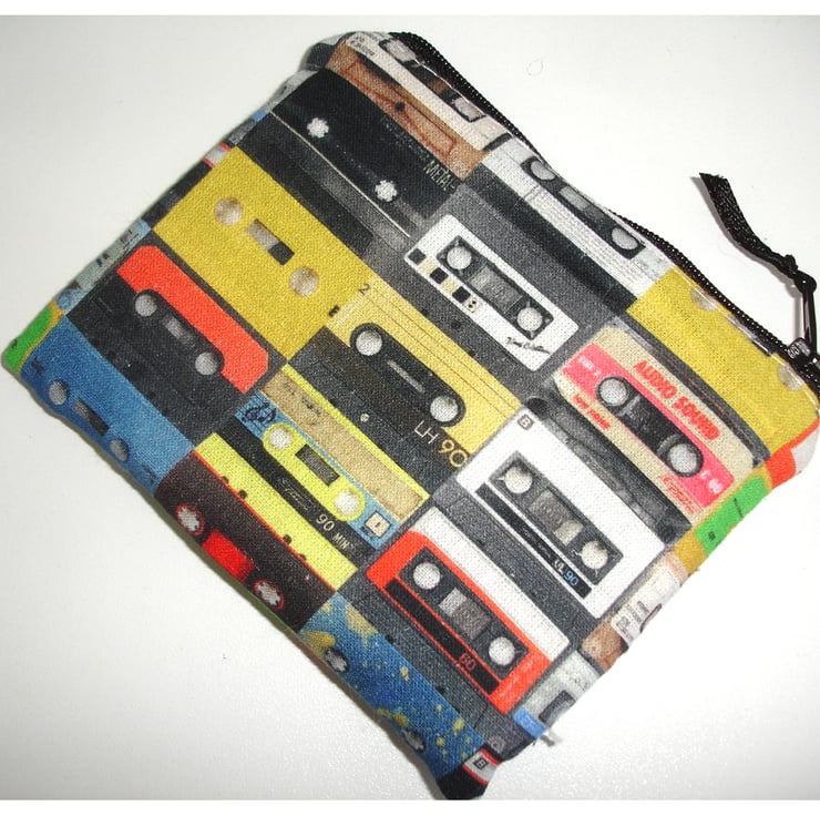 This little zipped coin purse features retro 1980s / 1990s Cassette Tapes in Red Blue Green Black and Yellow