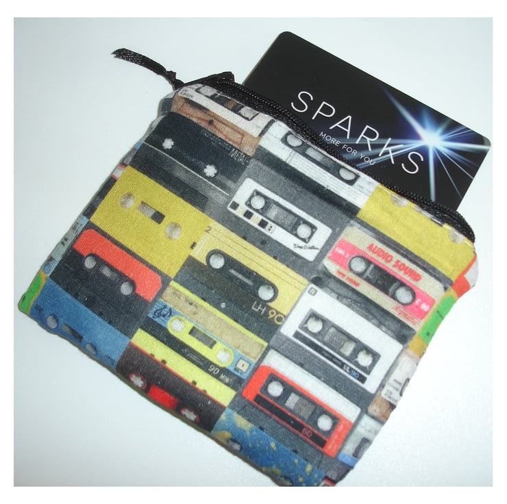 This little zipped coin purse features retro 1980s / 1990s Cassette Tapes in Red Blue Green Black and Yellow