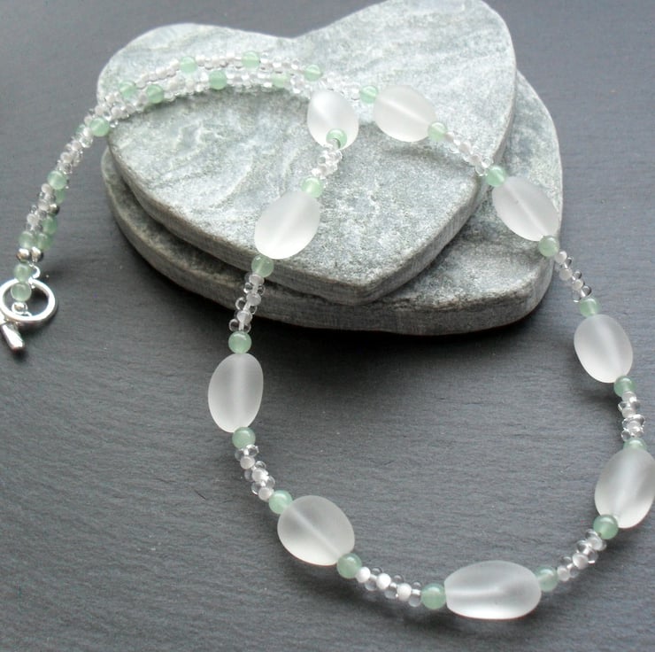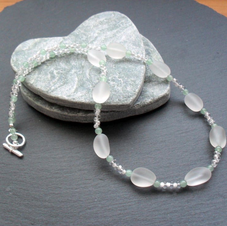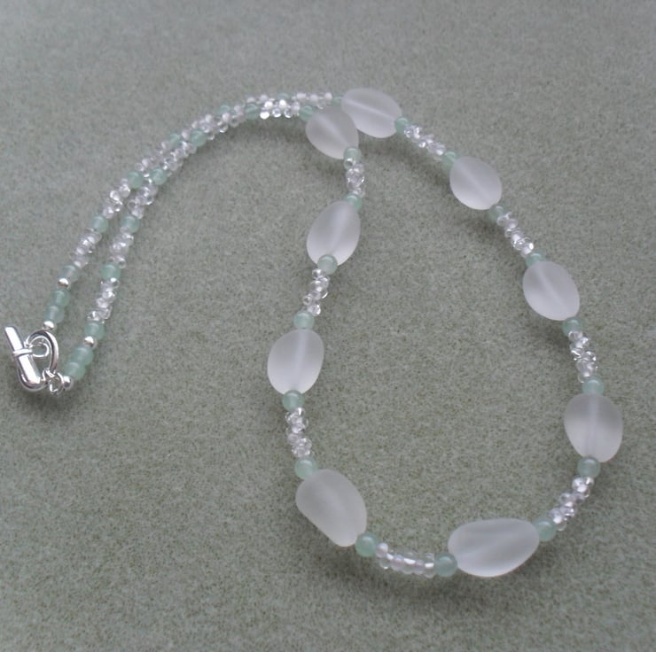 This necklace has been made with frosted white quartz, pale green aventurine semi precious gemstones and clear/white glass beads. The necklace fastens with a silver plated toggle clasp.