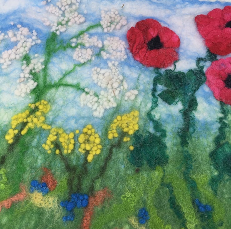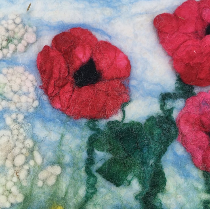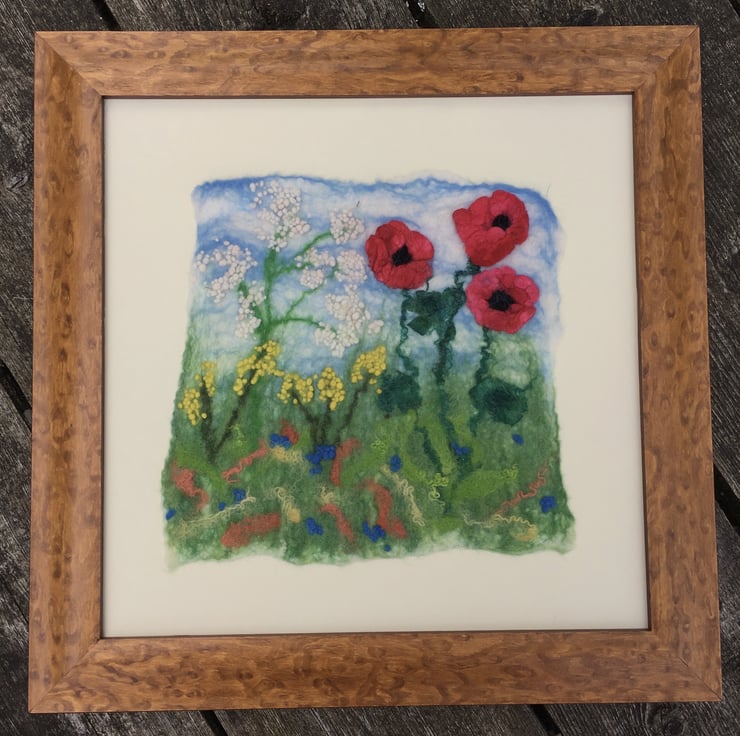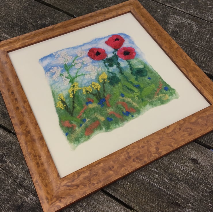 This gorgeous picture of poppies and other wild flowers has been hand felted using a background of merino wool fibres and various other woollen and silk fibres have been used to create the flowers. After careful design and layout, the picture has been wet felted. The final piece has been left with organically shaped edges and has been mounted on a cream coloured mount card and framed, without glass, in a square 37.5 cm x 37.5 cm (14.75" x 14.75") (external dimensions) ornate wooden frame.