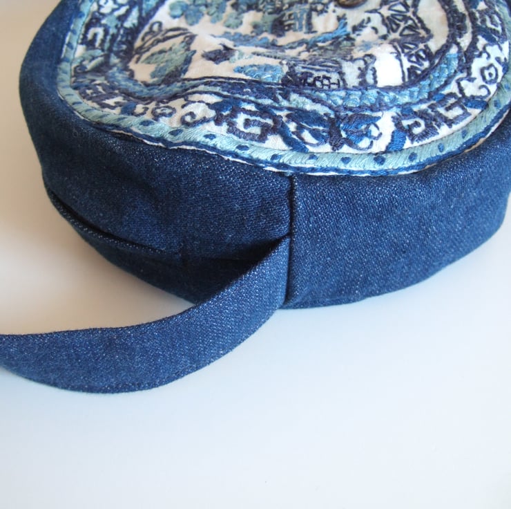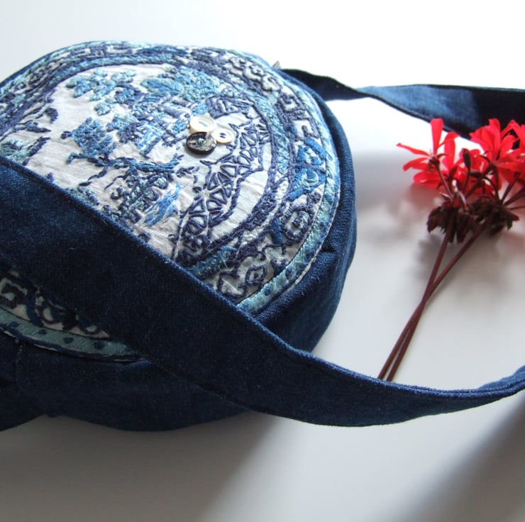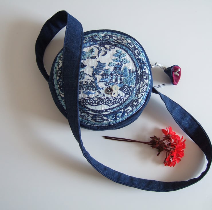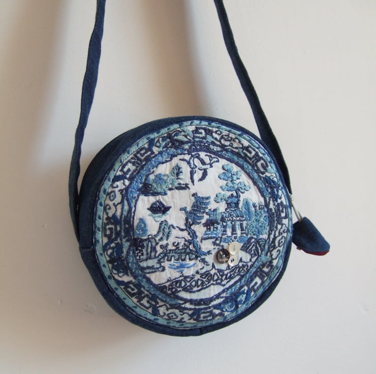Circular shoulder bag in a vintage embroidery blue and white willow pattern plate design.