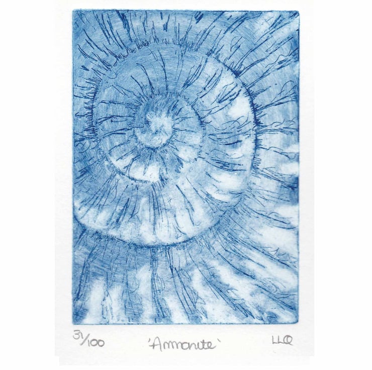 This is no.31 of 100 variable etchings from a yearlong project. The inspiration was an ammonite fossil that I found on the Jurassic coast in Dorset. The form perfectly preserved in every way. The etching was made by drawing with an etching needle onto a pre-treated zinc plate which has then been bathed in acid and once inked up run under pressure through my printing press.