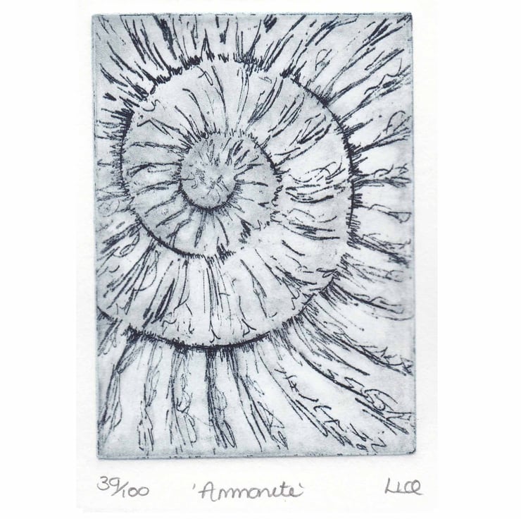 This is no.39 of 100 variable etchings from a yearlong project. The inspiration was an ammonite fossil that I found on the Jurassic coast in Dorset. The form perfectly preserved in every way. The etching was made by drawing with an etching needle onto a pre-treated zinc plate which has then been bathed in acid and once inked up run under pressure through my printing press.