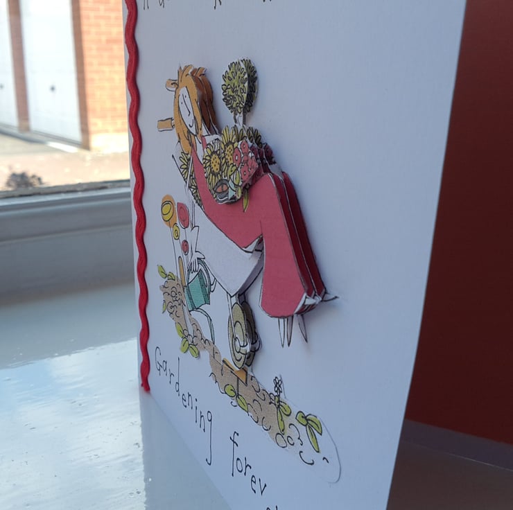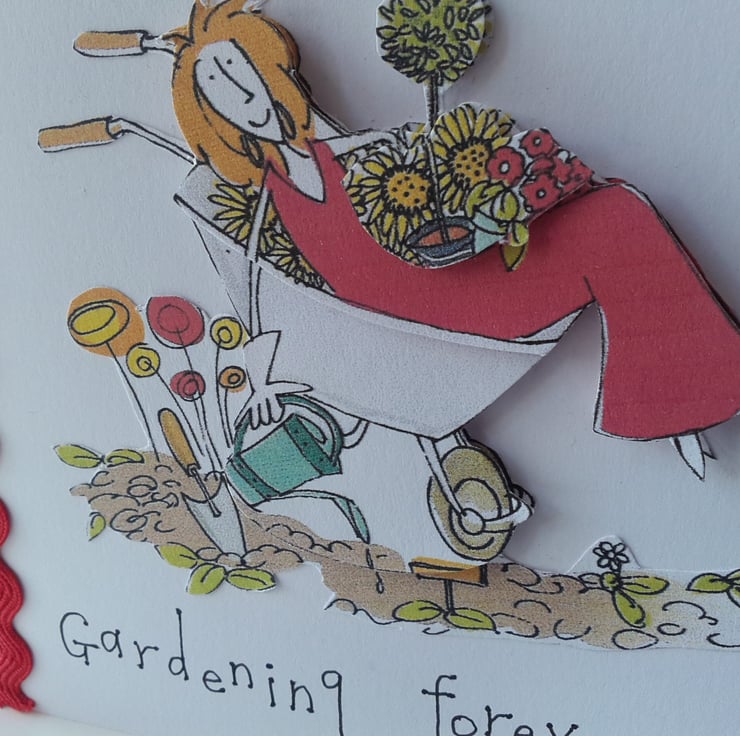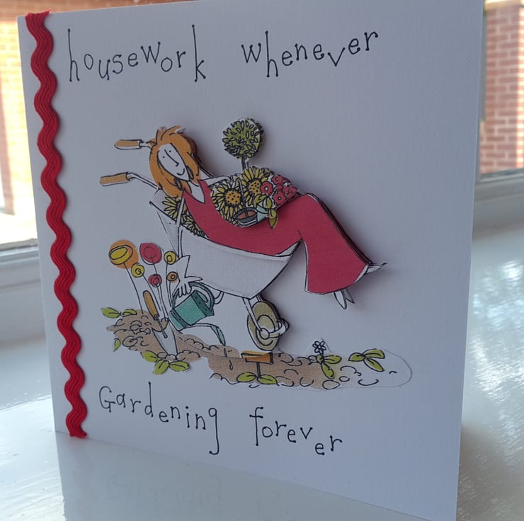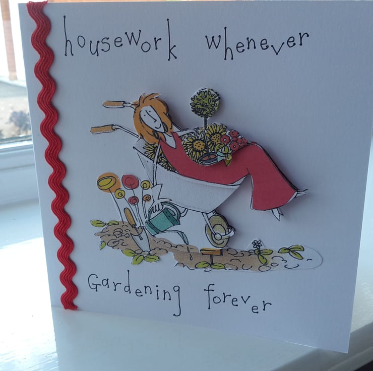 A completely handmade and uniquely designed card. Consisting of a decoupaged design of a lady relaxing in wheelbarrow and watering her garden. Mounted onto pristine white quality card. Finished off with bright red Ric rac ribbon and the words housework whenever,, gardening forever