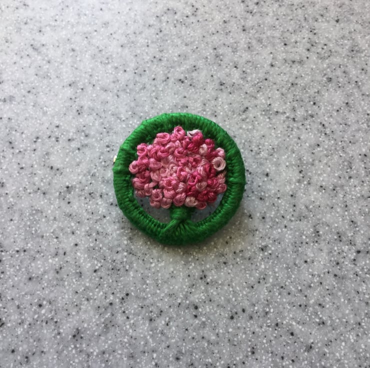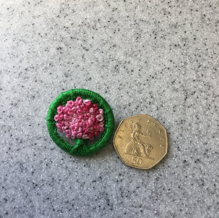 I have made this Dorset button brooch using green cotton Perle thread on a 32mm brass ring. I have then embroidered French knots on it using an embroidery silk which changes shades from pale pink to bright pink.