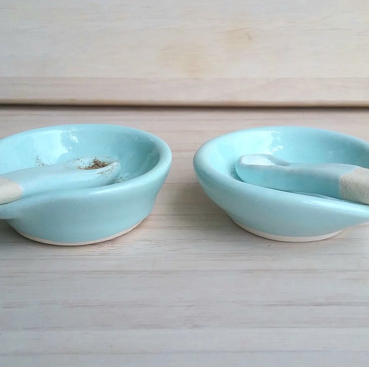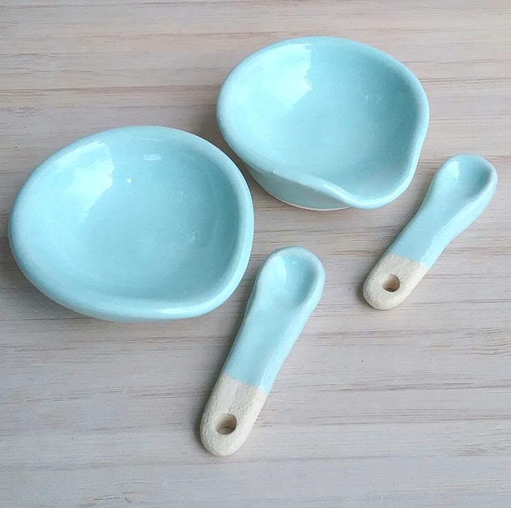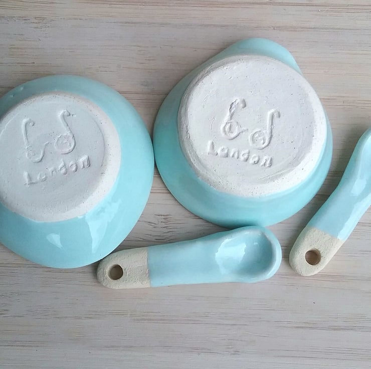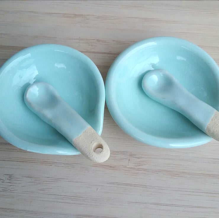 Each little dish was thrown off the hump and altered for small spoon to sit in. The tiny spoons were handmade. Once the pieces were bisque fired they were glazed using hand mixed earthenware glaze prior to final firing.