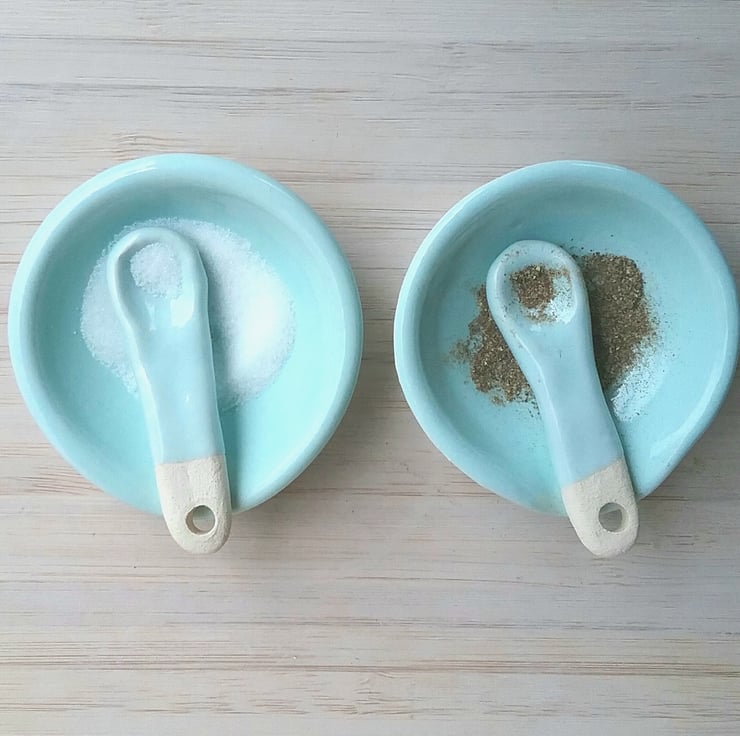 Small salt and pepper pots with small serving spoons in white clay with hand mixed turquoise earthenware glaze.