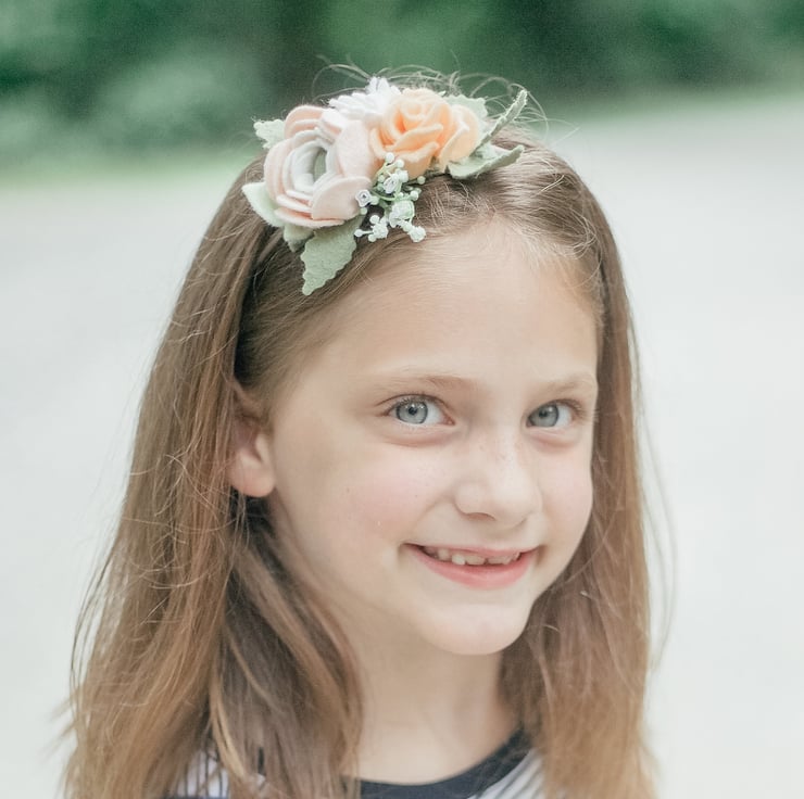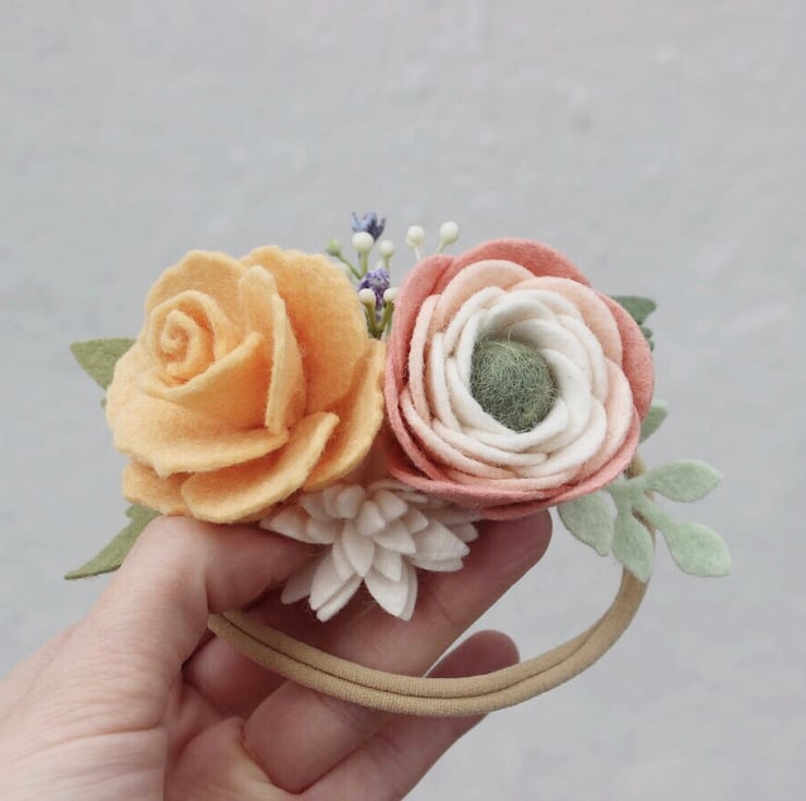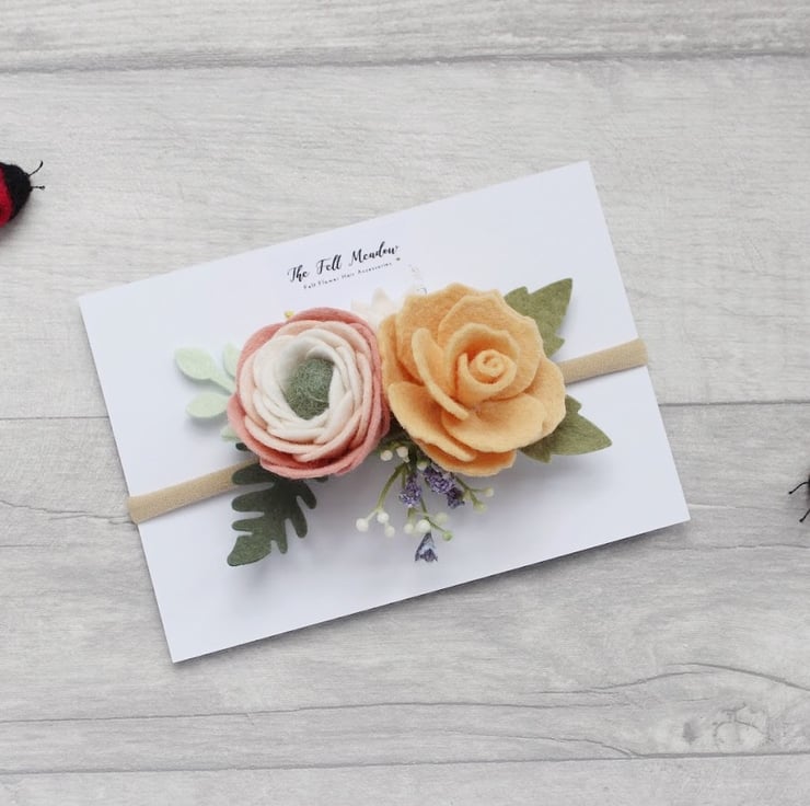 A Summer inspired felt flower headband with a blush ranunculus and a peach rose with leaves attached to a super soft strechy nylon headband or alice band. This arrangement measures about 3" to 4" across. It may vary slightly in size due to the handmade quality. Suitable for children and adults. Ideal for festival goers, boho-themed parties, wedding hair accessories or to liven up any summer outfit.