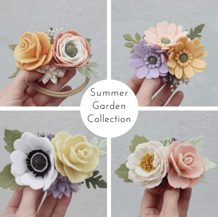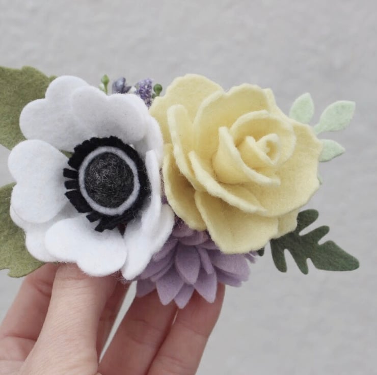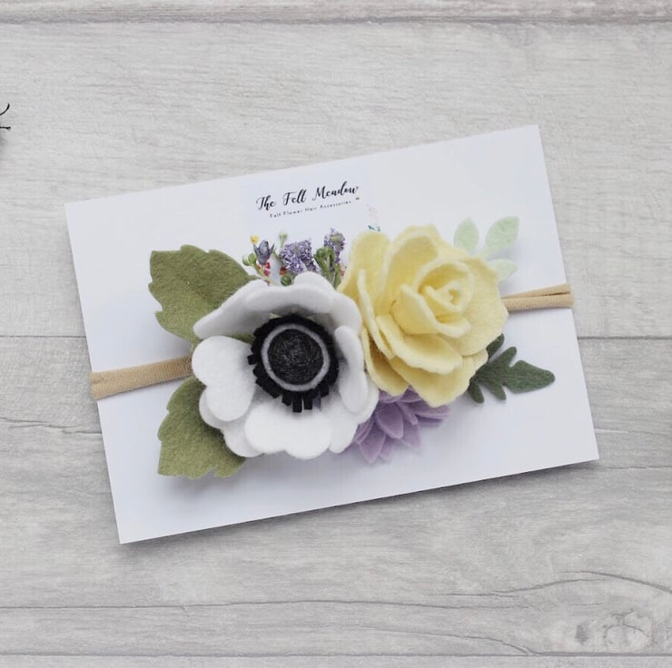 A Summer inspired felt flower headband with a white anemone and an ivory rose with leaves attached to a super soft strechy nylon headband or alice band. This arrangement measures about 3" to 4" across. It may vary slightly in size due to the handmade quality. Suitable for children and adults. Ideal for festival goers, boho-themed parties, wedding hair accessories or to liven up any summer outfit.