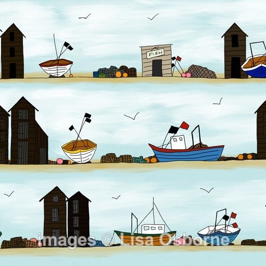 Fishing boats and huts - high quality, open edition print of boats on the beach with fishing huts and nets from one of my digital illustrations.