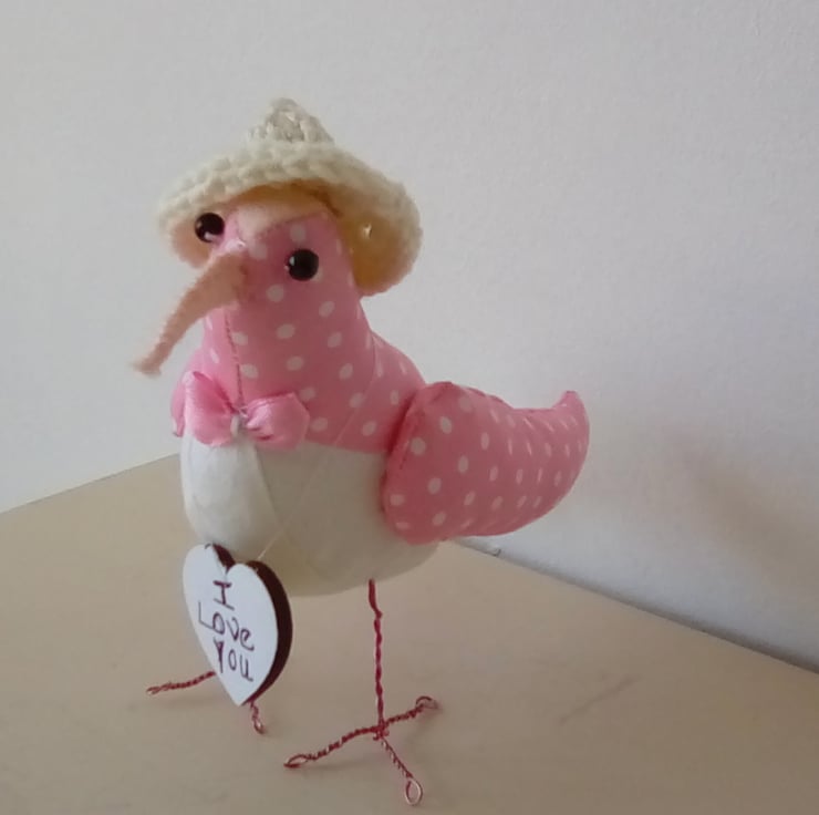 She is made of cotton fabric and has a knitted bonnet, to keep the sun from her eyes. She has sturdy wire legs and a pink felt beak. She stands 4 inches tall and from beak to tail measures 7 inches.