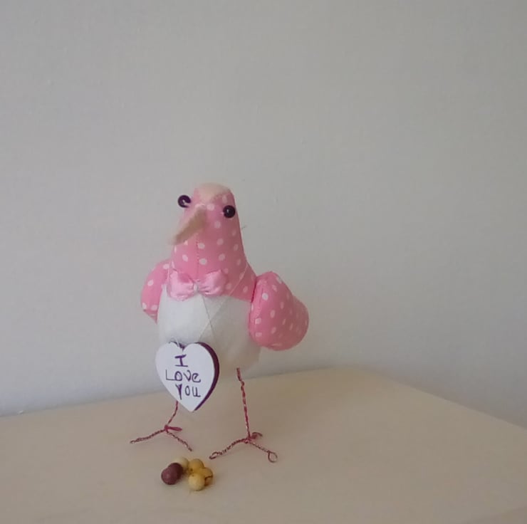 She is made of cotton fabric and has a knitted bonnet, to keep the sun from her eyes. She has sturdy wire legs and a pink felt beak. She stands 4 inches tall and from beak to tail measures 7 inches.