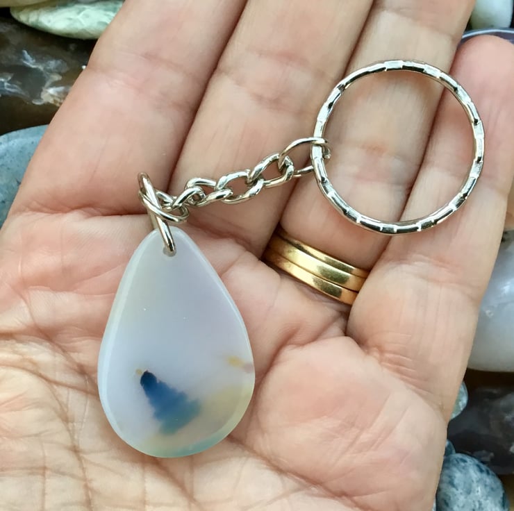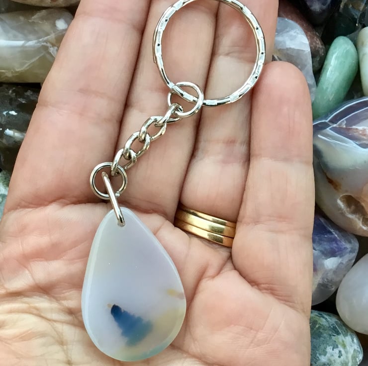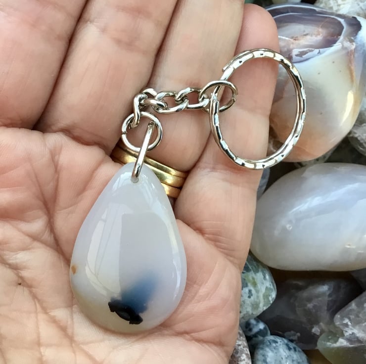 A pretty Dendritic Agate teardrop internally flecked Gemstone Keyring, with silver tone keychain & split ring, to make this item useable as a keyring, or handbag charm.
