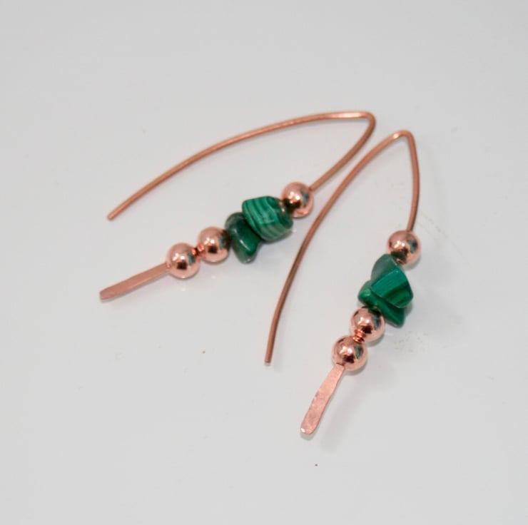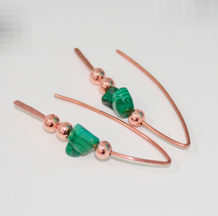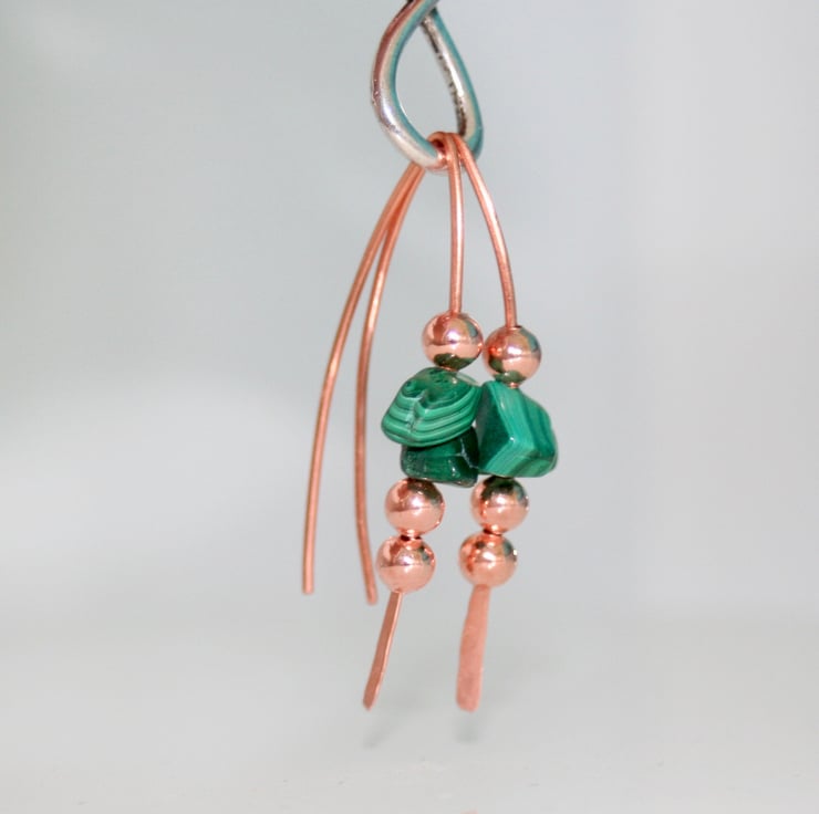 Earrings made with gorgeous striated green malachite nuggets and round copper beads strung onto a single piece of copper wire that has been hand-shaped into long earwires. The bottom of the earwire has been hammered flat and texturised.