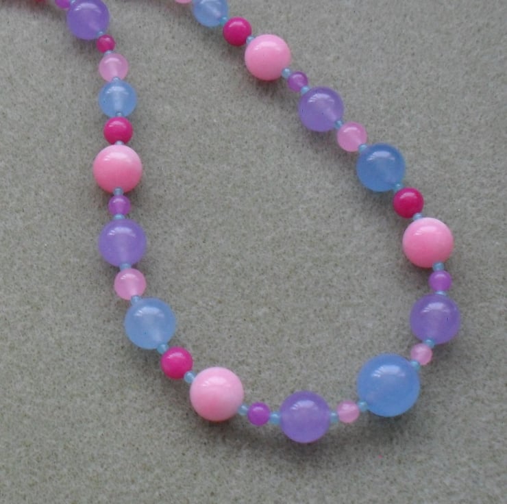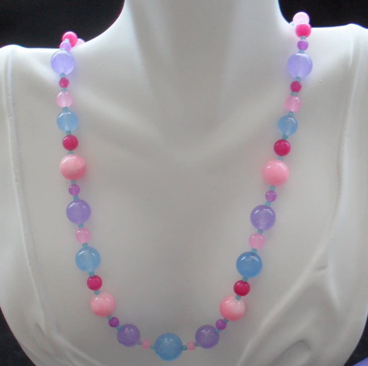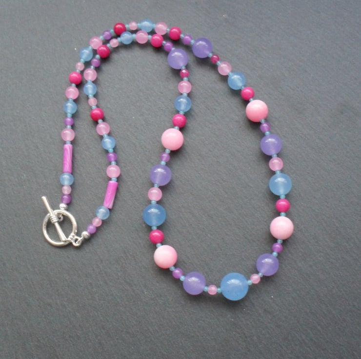 Colourful dyed quartz in pinks,blue bright pink and lilac are beaded onto beading wire and attached to a silver plated toggle clasp.