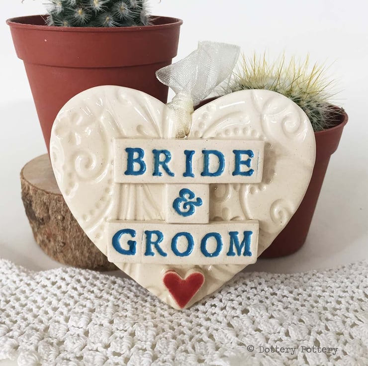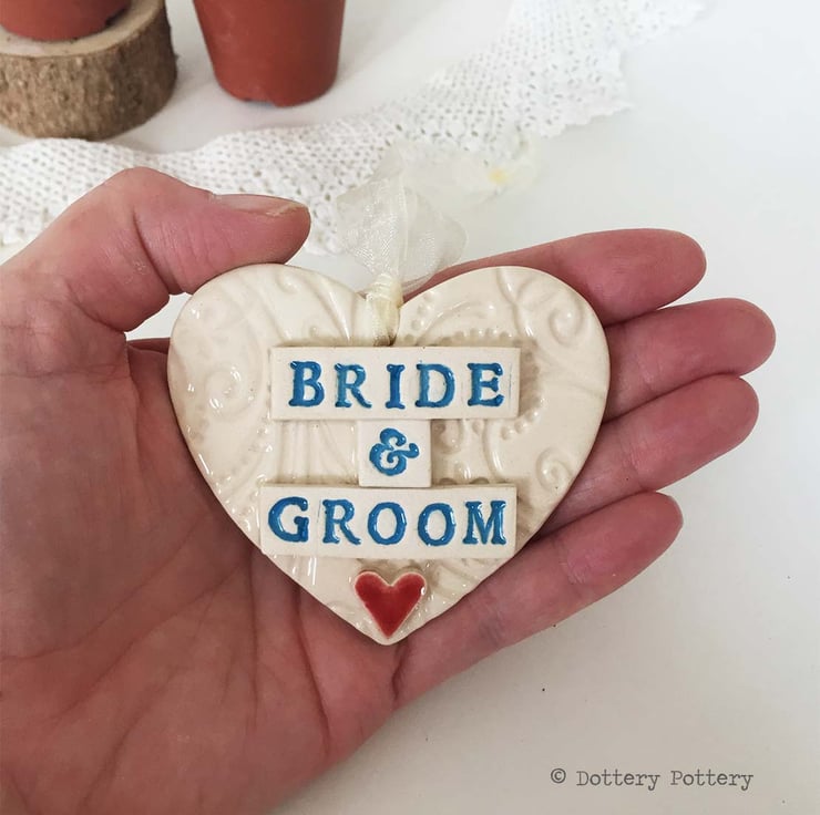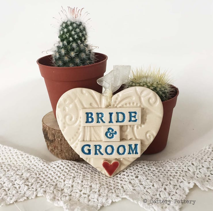 This very special Wedding gift can be used as a tag on a Wedding gift and then re-used by the happy couple as a decoration. It has been made from earthenware clay, decorated and then fired once. It has then been glazed and fired again.It measures 8cm wide x 7 cm high and 1cm deep. It is plain on the back and finished with a cream organza ribbon.