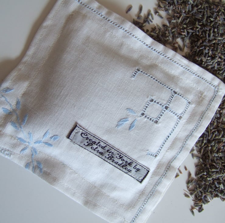 This little vintage linen coaster with its tiny embroidery of a crinoline lady was too good to stand a mug of coffee on. It has been lovingly transformed into a pretty pouch full of Yorkshire lavender.