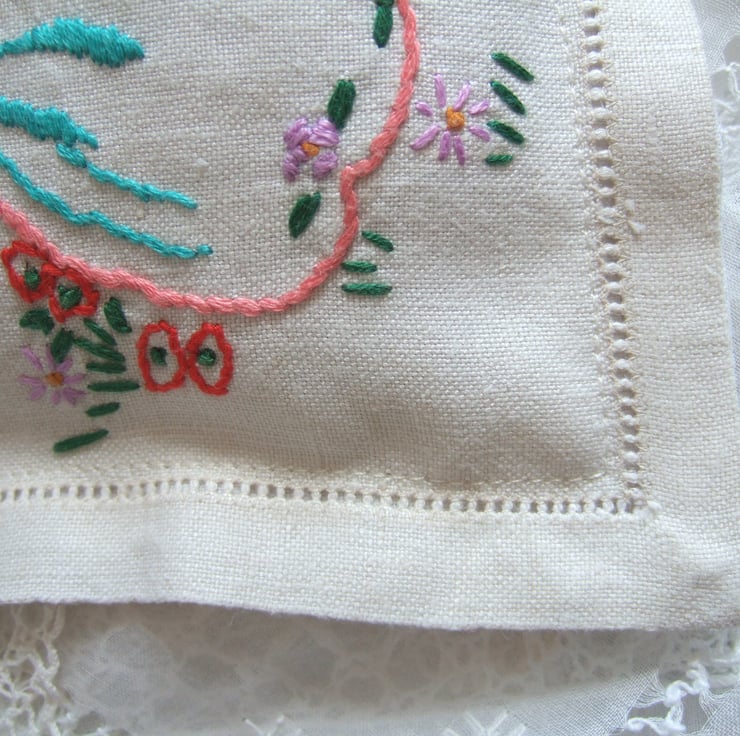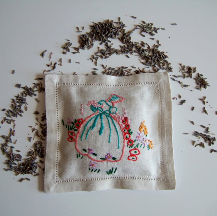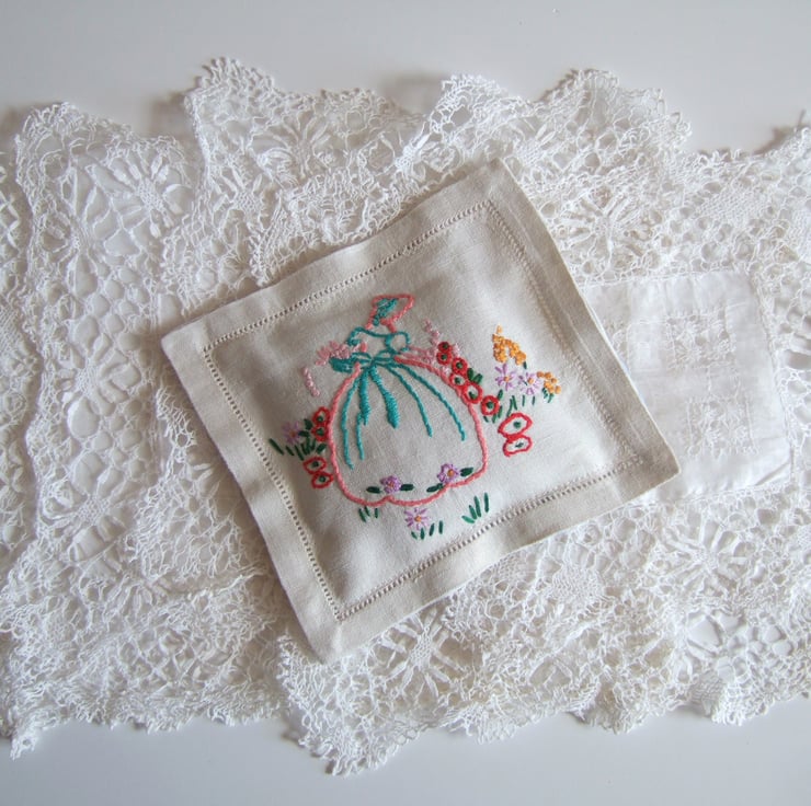 Ah, lavender, the ancient remedy for refreshing sleep and linens. This pretty vintage coaster with its sweet embroidery of a crinoline lady will freshen up a drawer of vintage linen, your clothes, or a wedding trousseau. Or, pop it under your pillow to aid a good night’s sleep. The back has been made from the corner of a vintage tray cloth with a pulled thread work design, to help waft the lovely scent out. It would make a lovely present for a bride to be, a textile lover or an embroiderer.