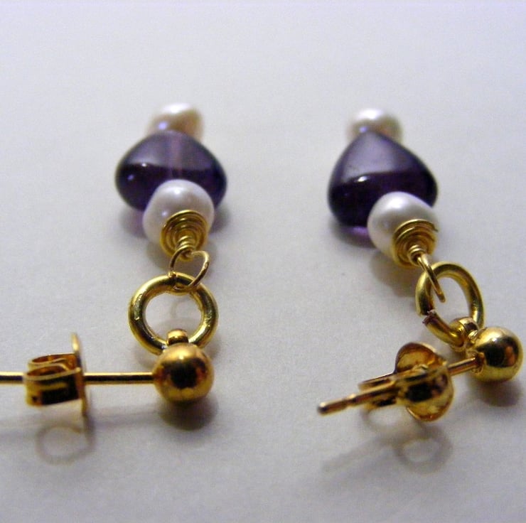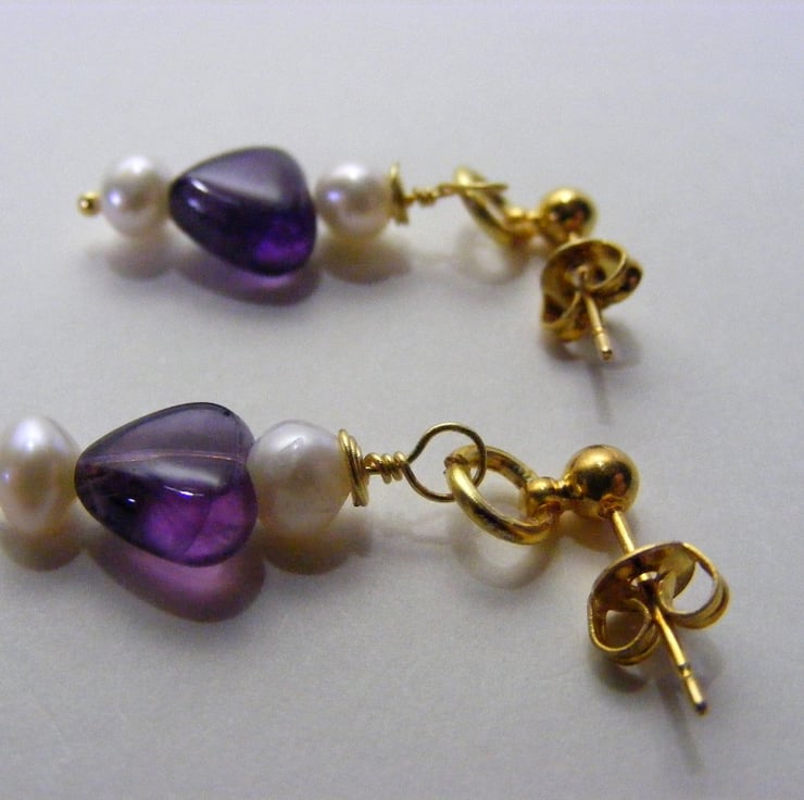 These one of a kind gemstone and pearl earrings are made with 7 x 8 mm amethyst hearts and 5 x 4 mm white freshwater pearls. Hearts and pearls are wrapped on gold plated ball headpins. Attached studs with butterfly backs are gold plated.