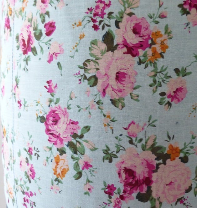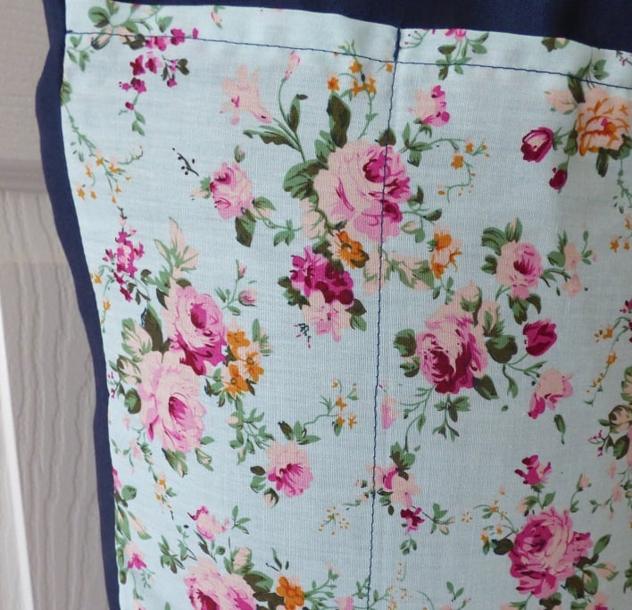 The strong handles are 33cm long, across the top measures 35cm, and 46cm down. Ive added a pocket of floral cotton fabric featuring beautiful pink roses, which has been divided into 2 sections measuring 23cmx8cm and 23cmx25cm.