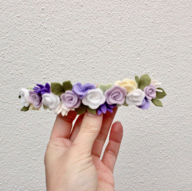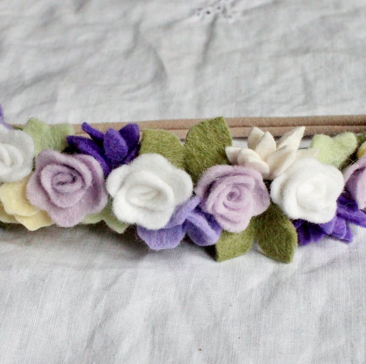 This is a delicate purple and lilac headband with greenery. Ideal dainty crown for your little newborn. If you would like different colours please get in touch!