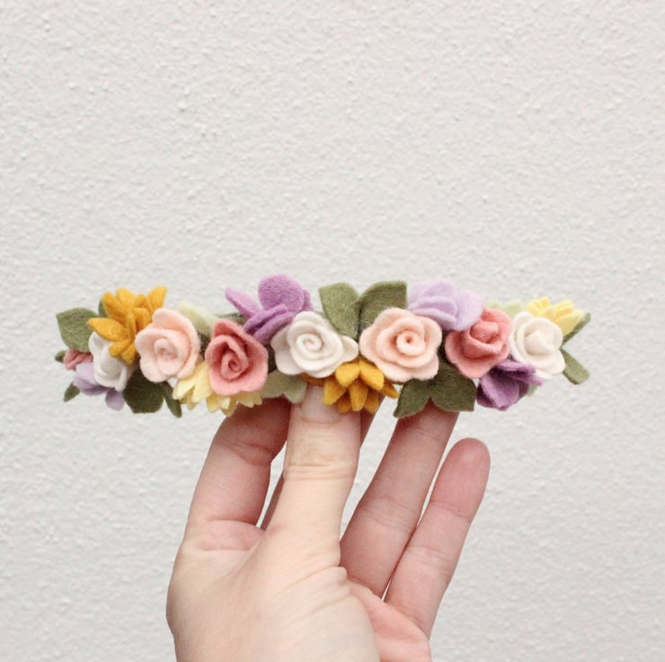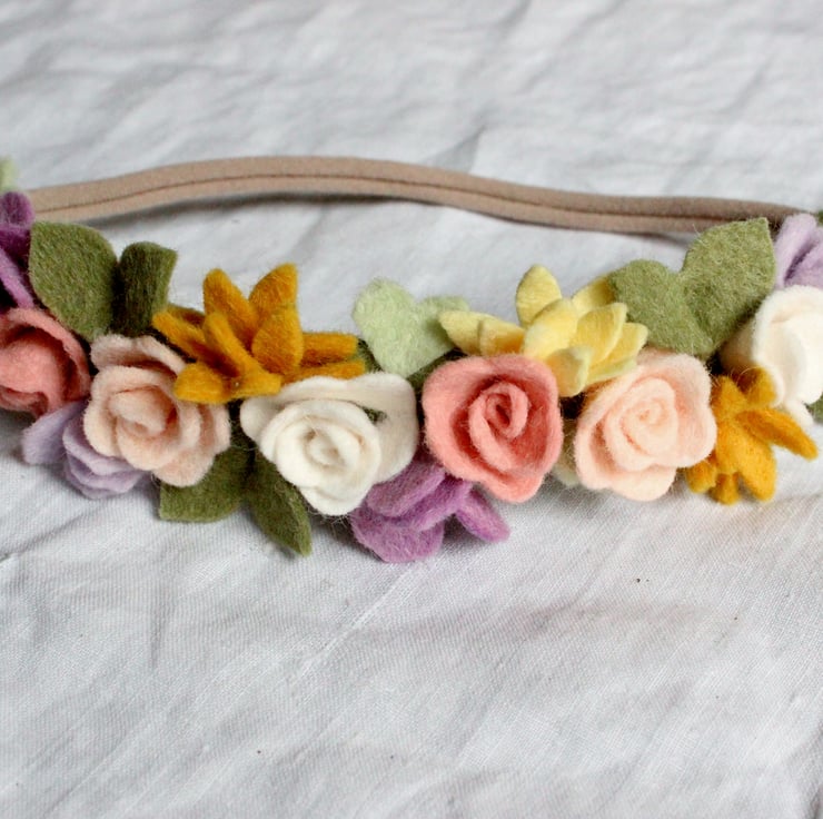 Each tiny rose measures approx 1.5cm. They are attached securely to a soft nylon headband. This will stretch to fit your child's head and is gentle and non-marking.