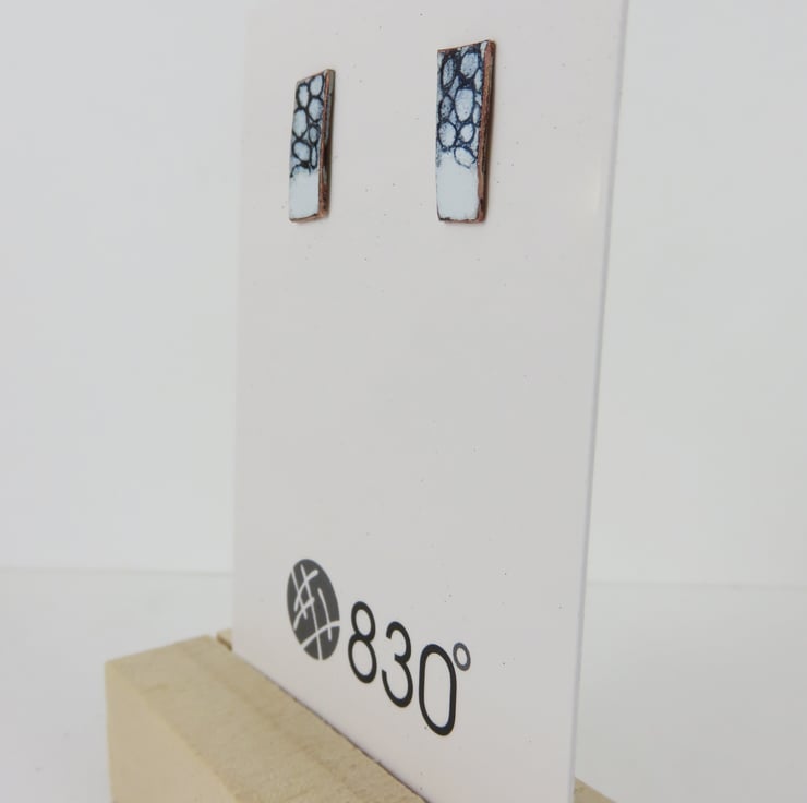 These hand cut copper studs measure approximately 12mm by 5mm. A layer of blue enamel is fired on the surface followed by a white layer. Before I fire a second time I draw through a pattern of circles revealing the blue below. Silver earring posts are soldered on the back. You can wear them any way up you wish. Delivered to you in a 830 Degrees gift box.
