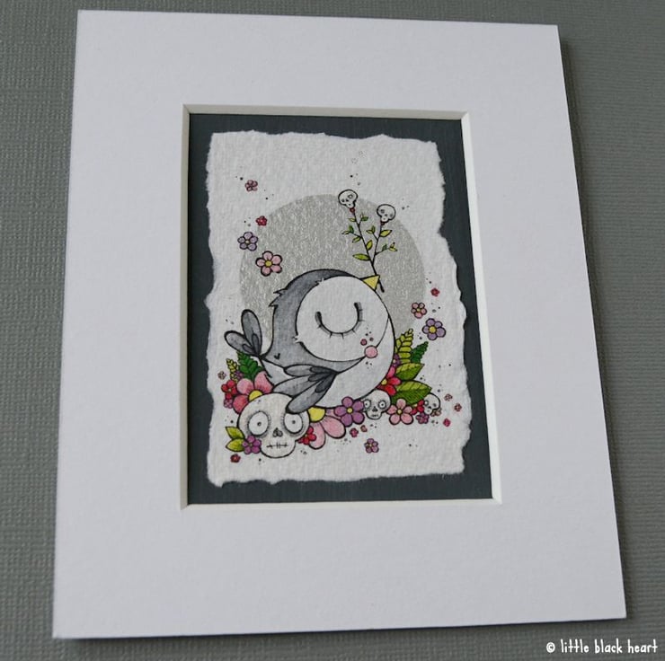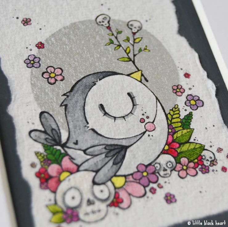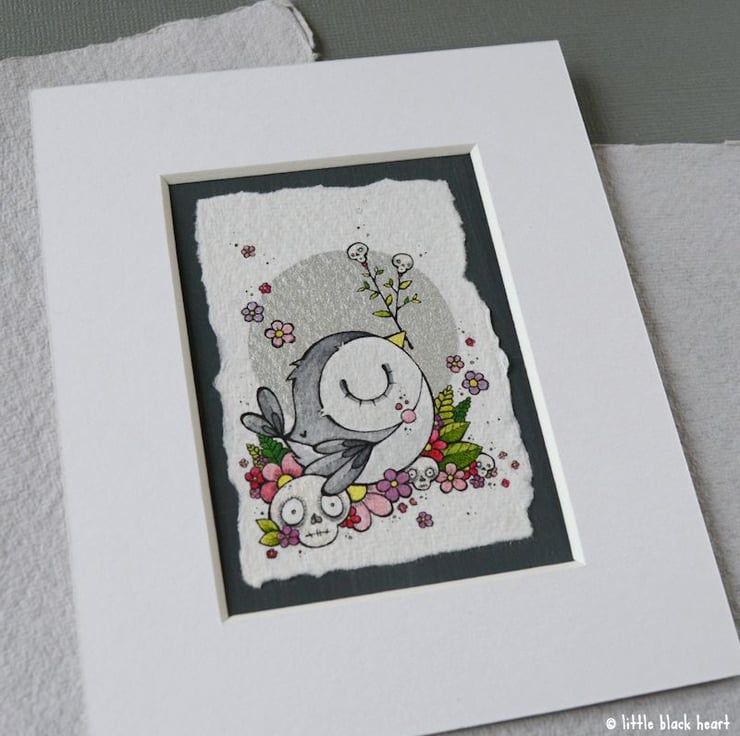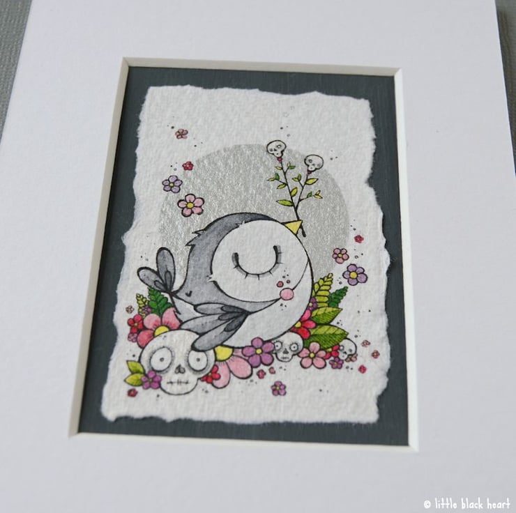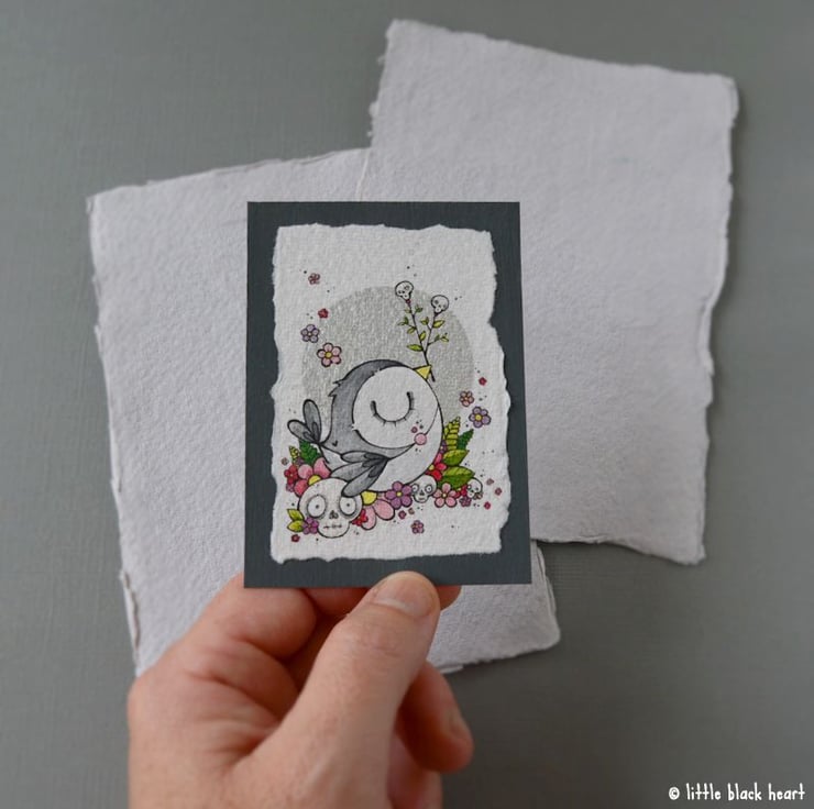original artwork in artists pens and watercolour paints, on textured white khadi paper, which is handmade in india from recycled cotton rag. the paper has been hand torn to create a deckled edge, which I have then mounted to a dark grey hand painted aceo.