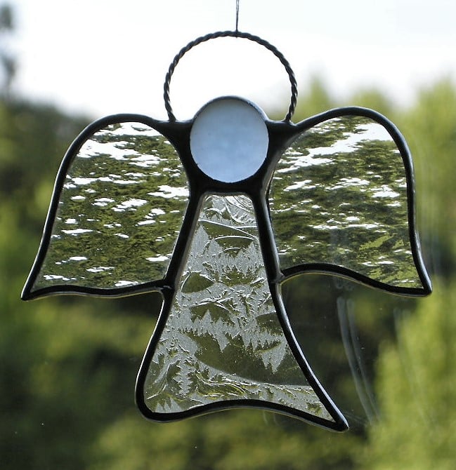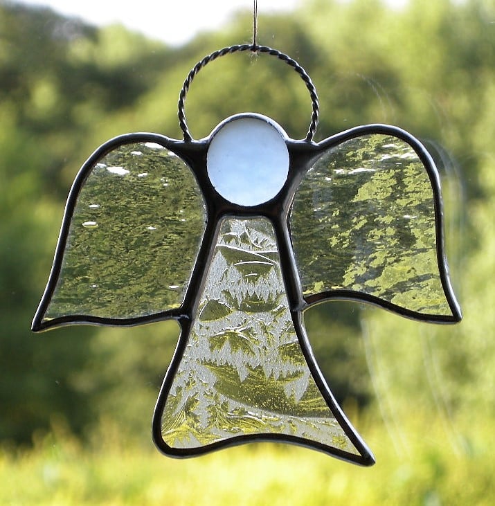 Beautiful stained glass abstract designed hanging window suncatcher (Angel) has been handcrafted and designed by myself using the traditional copper foiling method. The design is effective with the glass colours, with this "Angel" is two different clear textures of glass for the body and wings. A glass glob (frosted pale blue) forms the head of the Angel.