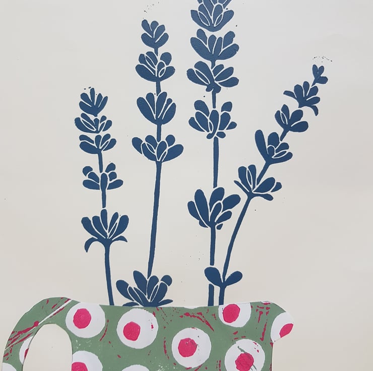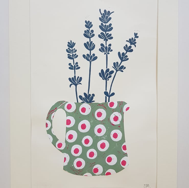 The spotty jug is collaged using my hand printed paper.