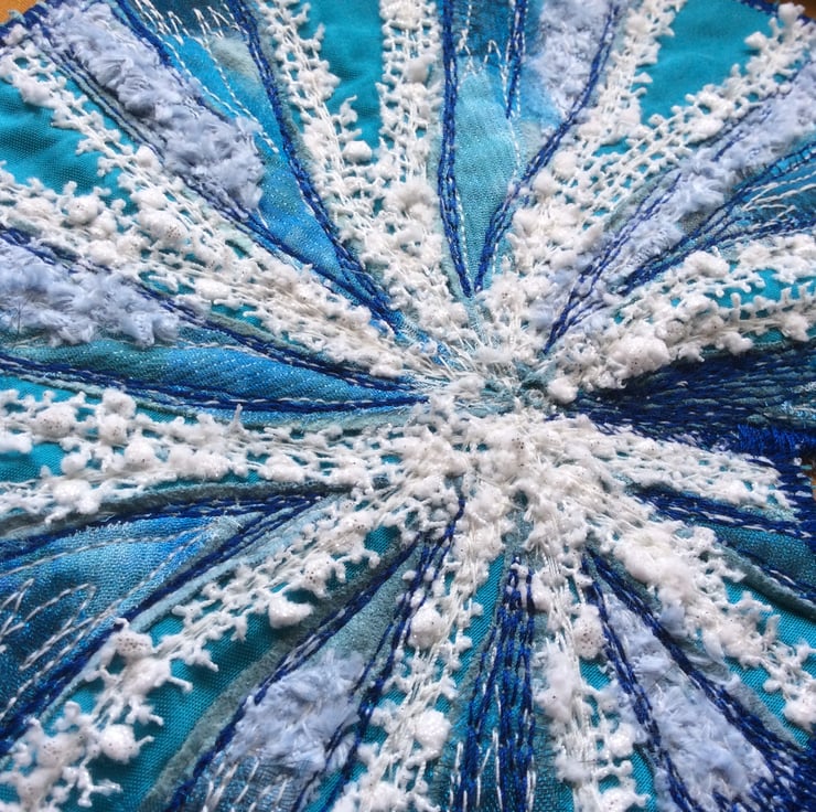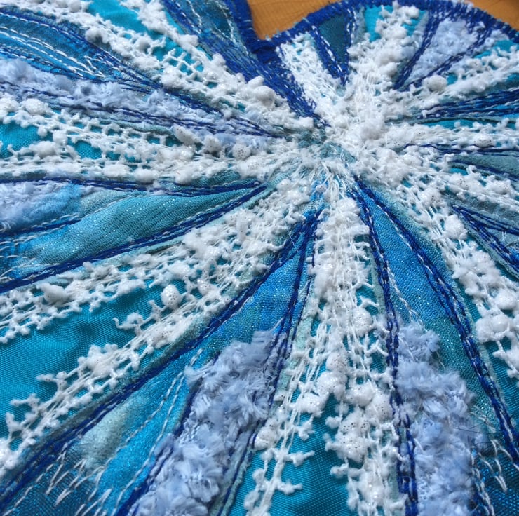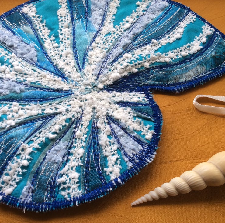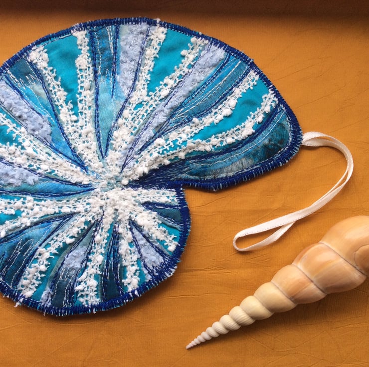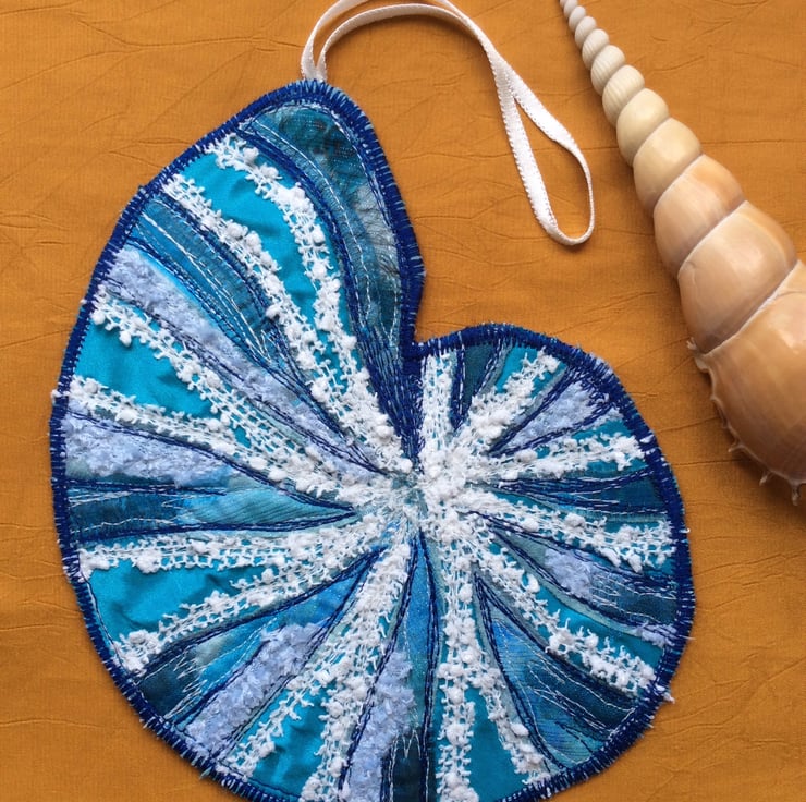 A few years ago I bought a porcelain shell whilst on holiday in Cornwall. It has the most glorious colours and I’ve wanted to try something like it for awhile, this is my version. It’s backed with white felt with a white ribbon the hang it by. The base is a luscious turquoise taffeta, with layers of gorgeous organza and other such lovelies, with free motion embroidery on top!