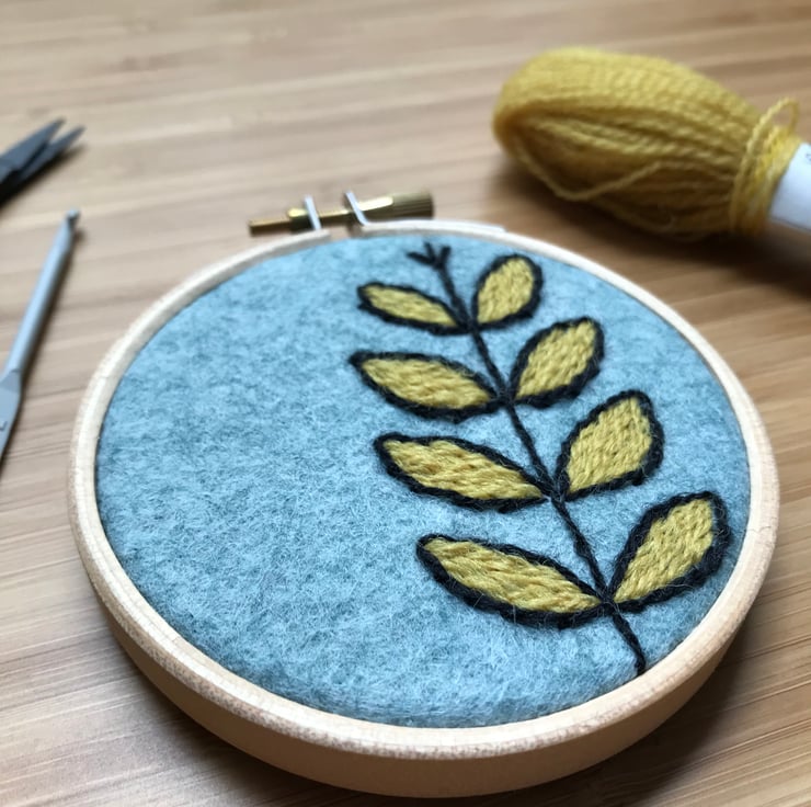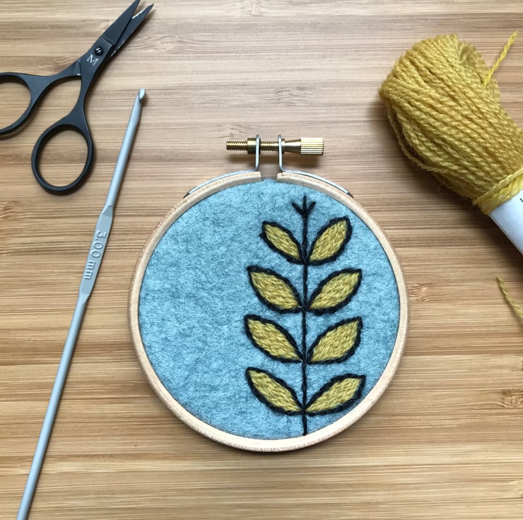 A single plant stem, stitched with yellow crewel wool onto 100% wool felt. The design is minimal and bold, and would look great as part of a gallery wall or propped on a shelf. The embroidery is framed with a traditional embroidery hoop.
