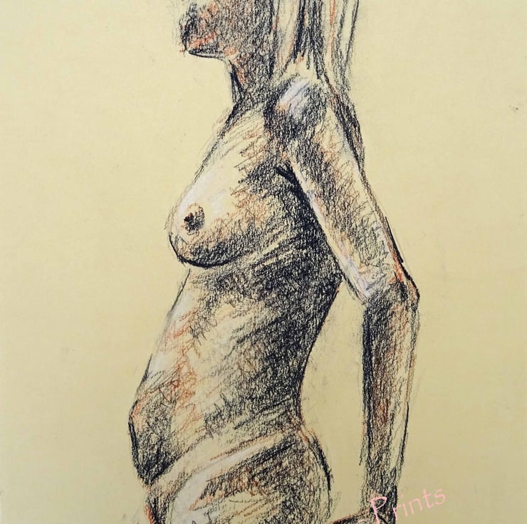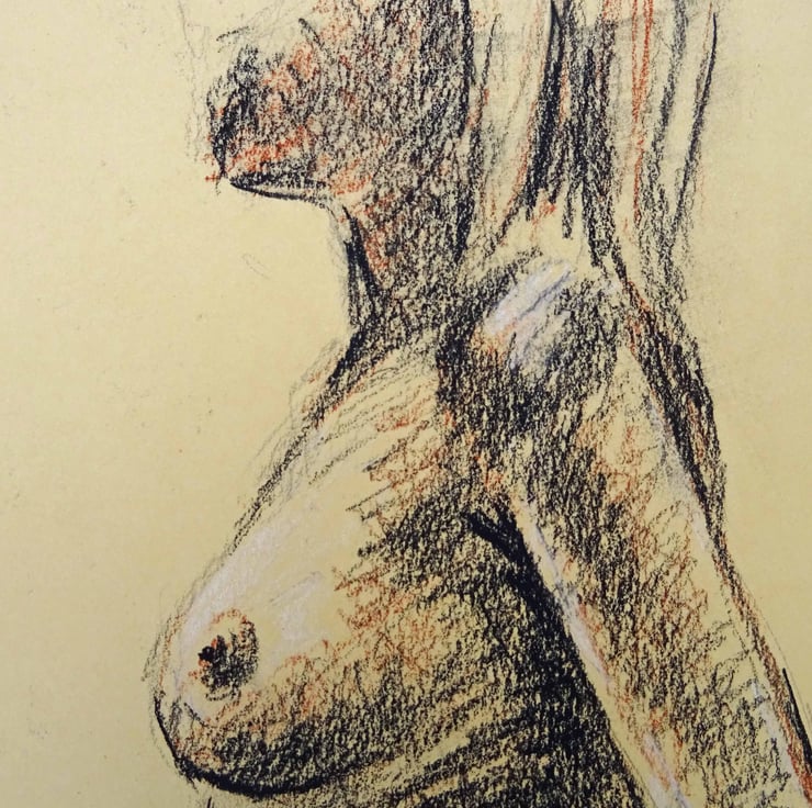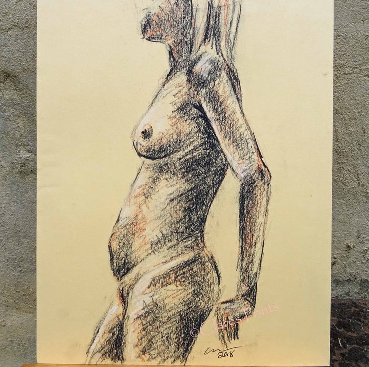 Original life drawing onto a cream paper. Drawn using conte pencils and sprayed for a fixative.