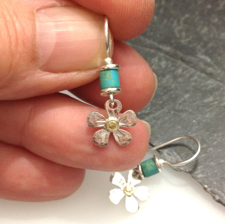 Silver Daisy earrings with 18ct gold centres and turquoise gemstone beads.