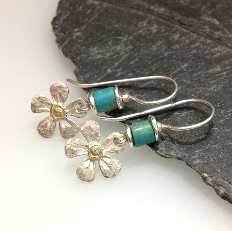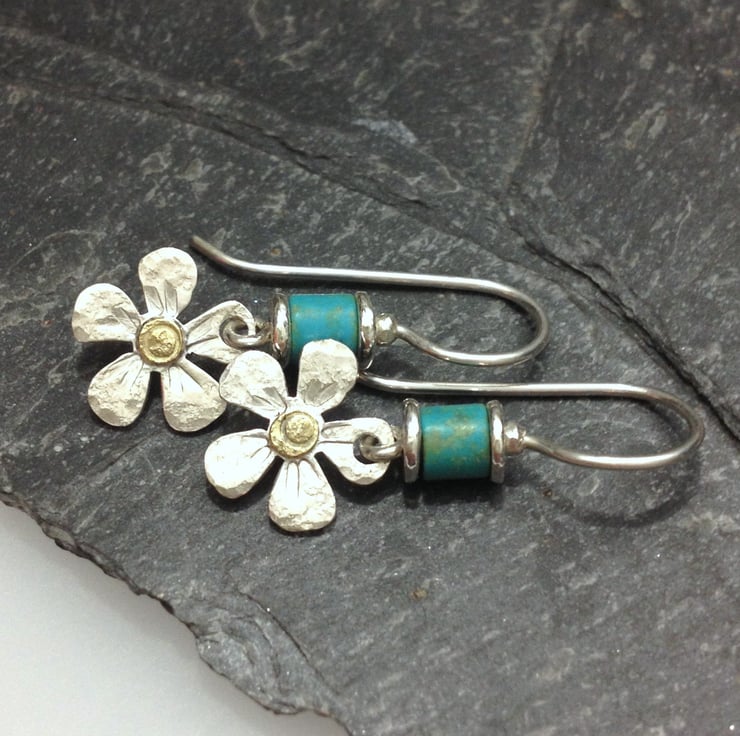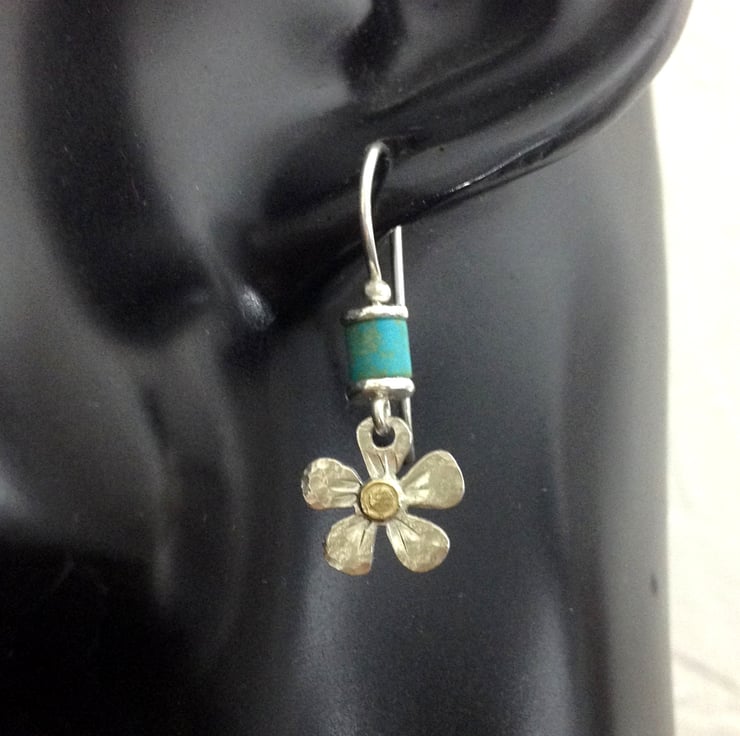 The small silver flower shapes have been given a hammered texture and punched detail, I have added an 18ct gold centre. These hang below a hand made hook ear with a bright turquoise tube bead.